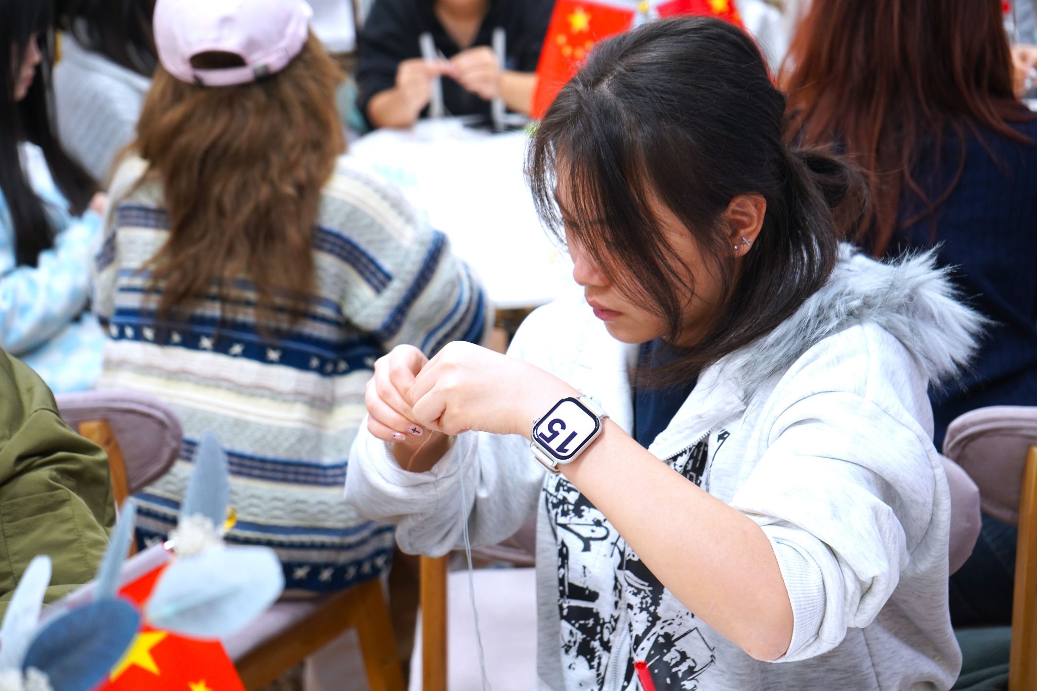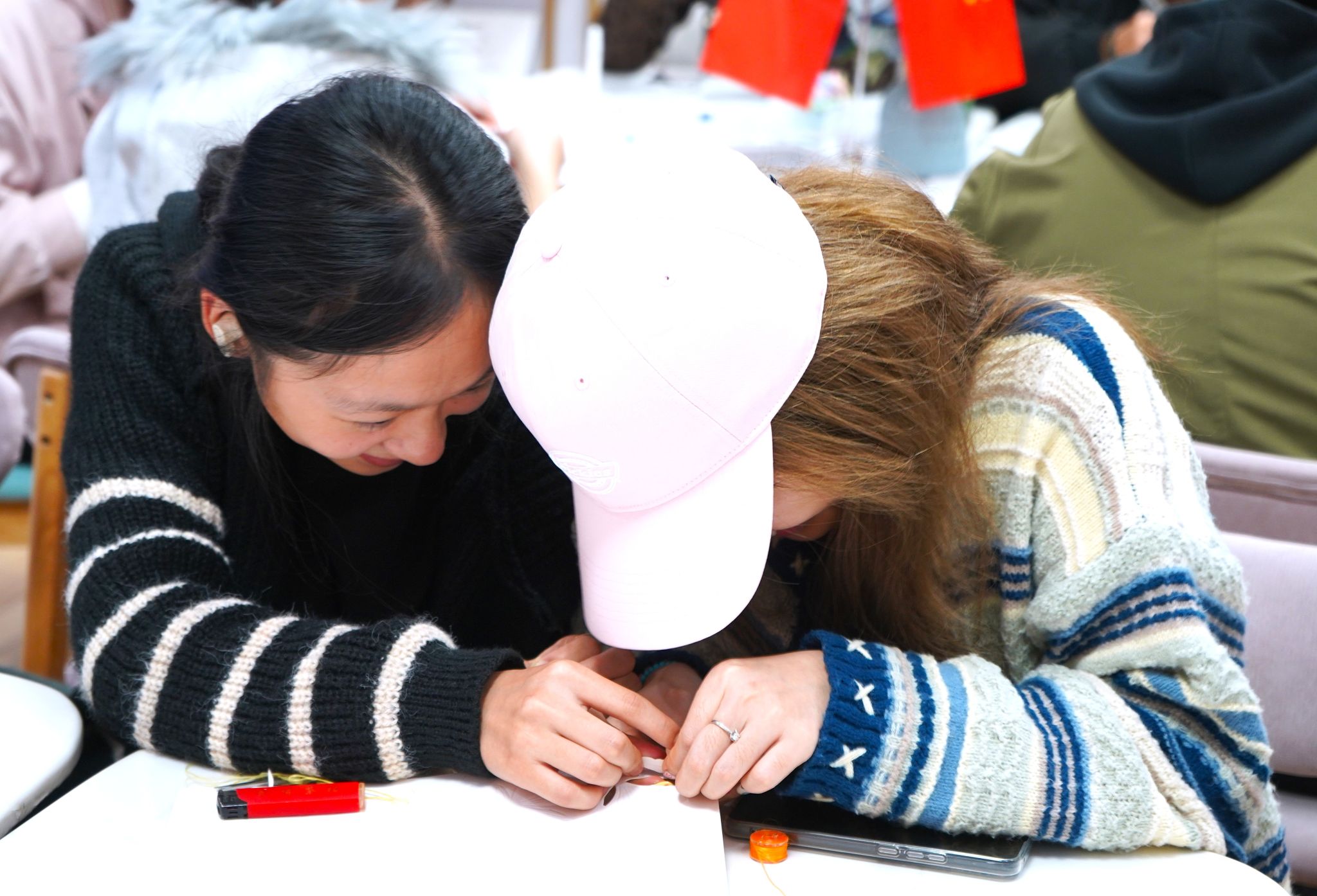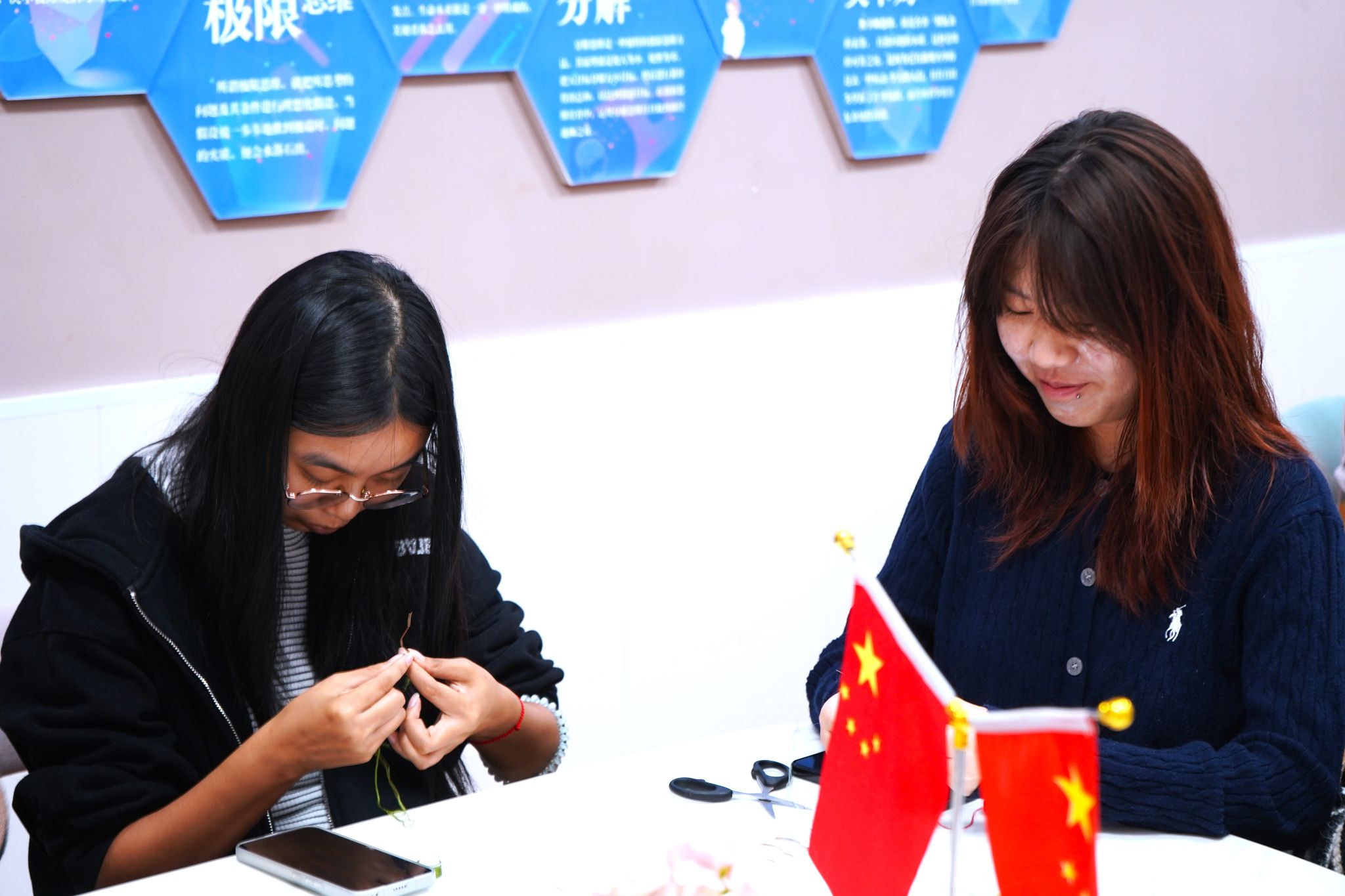 活动伊始,小组长逐一展示工具材料,细致拆解铜丝用途、丝线配色技巧,以及绕线松紧、剪片弧度对成品的影响。从铜丝弯折塑形到基础花片制作,从单色平绕到多色渐变缠绕,再到花瓣叶片的拼接造型,小组长俯身示范、细致答疑,手把手纠正操作手法,让技艺传承脉络清晰可见,助力同学们攻克创作难点。同学们在指导下循序渐进解锁核心要领。