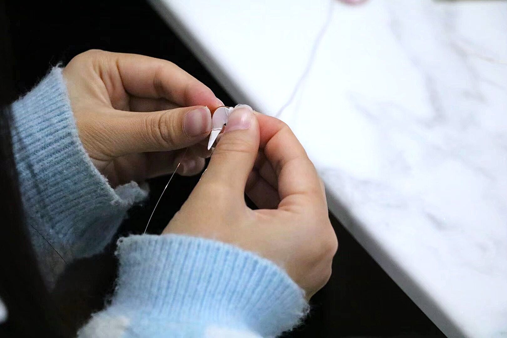 同学们围坐桌组成创作小团体,或低头钻研技法、反复调整细节,或轻声交流配色灵感与拼接技巧,彼此启发互助。一双专注的手将细腻丝线小心翼翼缠绕于铜丝花片之上,指尖轻捻、丝线翻飞,每一次穿梭精准到位,每一圈缠绕松紧适宜,凝聚着对传统工艺的敬畏与专注。
