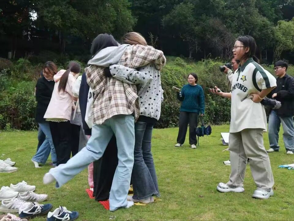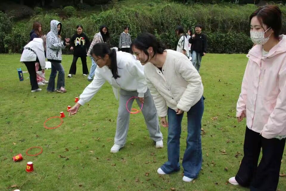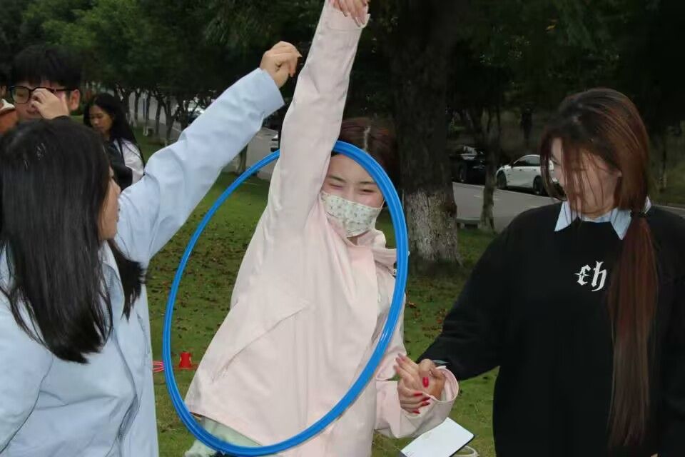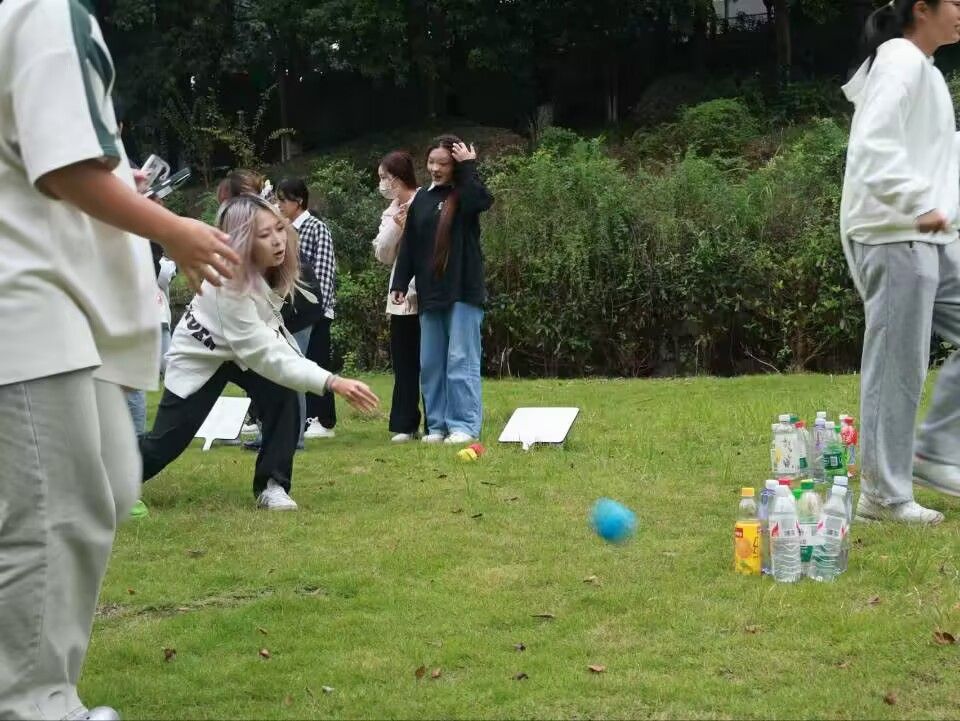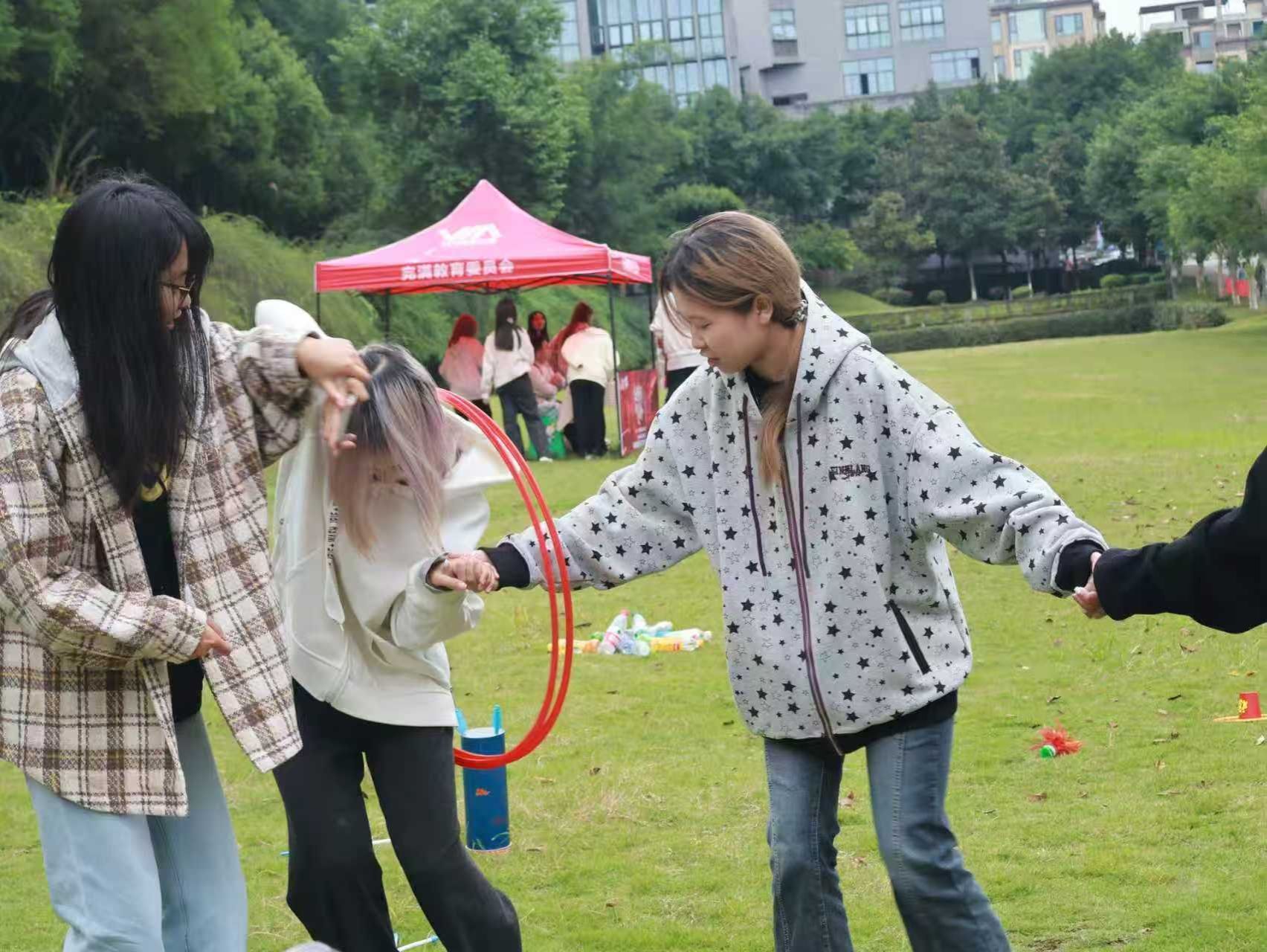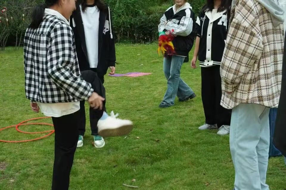 “踢毽子之乐,在于轻灵与专注。”彩色毽子在成员们的脚尖翻飞,有人单脚踢、有人双脚交替,计数声与笑声交织成校园里的热闹乐章。当有人成功连续踢满五个毽子时,周围立刻响起喝彩声——这一充满童真的传统游戏,让成员们暂时卸下学业压力,在跳跃与追逐中重拾童年纯真,也让传统民俗游戏的快乐在青春时光里延续。