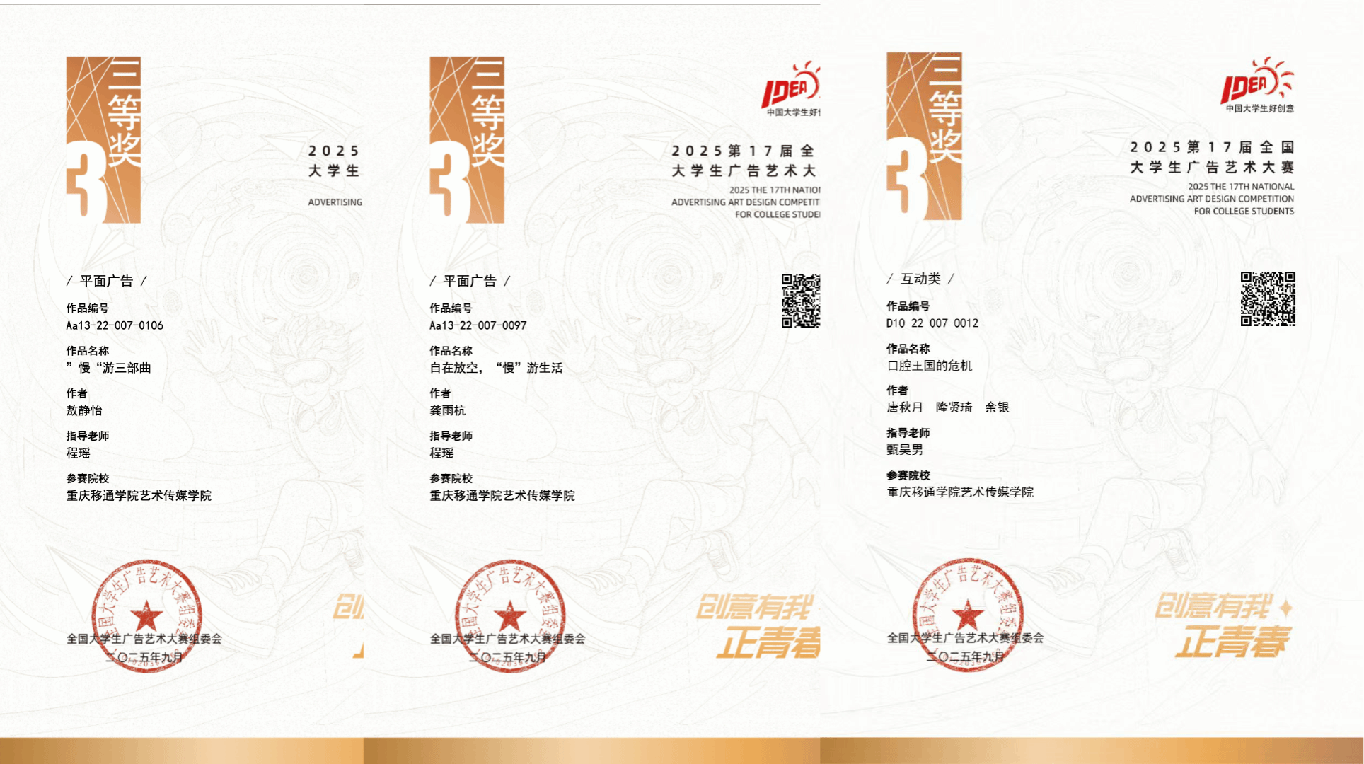 近日,第17届全国大学生广告艺术大赛(以下简称“大广赛”)省级评选结果揭晓,我校艺术传媒学院数字媒体艺术专业学子凭借扎实的专业功底、新颖的创意表达与娴熟的技术运用,在众多参赛作品中脱颖而出,斩获国奖、省级一等奖3项、二等奖23项、三等奖31项、优秀奖294项,获奖总数达300+项,创历史新高。其中,多件优秀作品成功晋级全国赛,充分展现了专业“艺技融合、产教协同”的育人成效与学子们的创新活力。