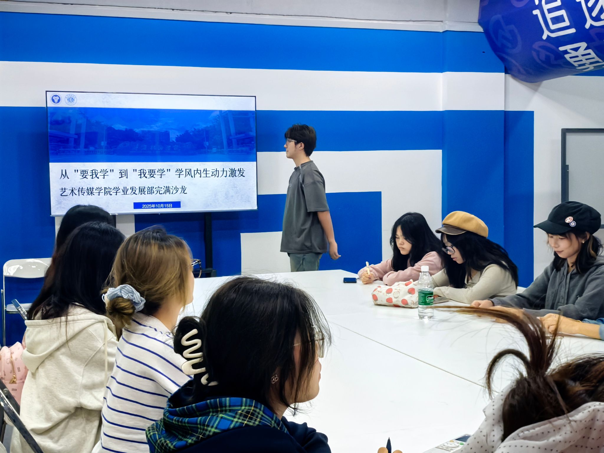 为深化学院学风建设,探索学生自主学习动力培养路径,10月15日下午,艺术传媒学院学业发展部以"从'要我学'到'我要学'——学风内生动力激发"为主题举办专题沙龙。学业发展部全体成员及指导老师徐冉齐聚天空书院朋辈畅谈室,通过案例分享、小组研讨和策略共创等形式,深入探讨如何构建"主动学习"的学风生态。
