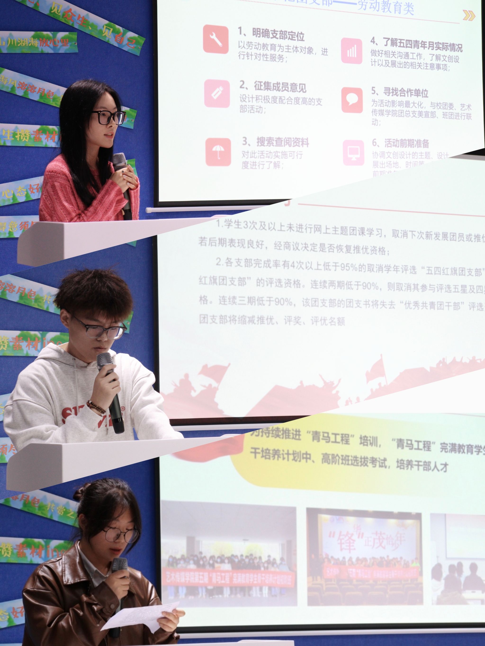 以完满为基,促团队成长。艺术传媒学院组织部三位部长分别从团务、青马工程、完满超级团支部三个方向为各位团支书进行讲解介绍。期间强调各班团支书要做好智慧团建录入,团员转入与转出,监督青年大学习的完成并收集,做好信息的上传下达等基础工作。并积极倡导各位学生骨干加入青马工程,提升综合素养,形成“全员育人、全员关注”的良好氛围。与此同时,艺术传媒学院组织部部长杨馨以自身班级为例,从活动的筹备,类型,对完满超级活动项目进行详细讲解,推动各基层团支部发散思维,用心筹划,共筑完满!