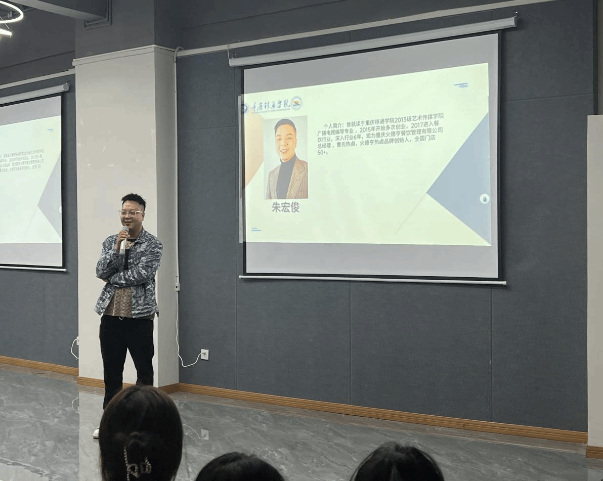 “以奋斗为楫,抵梦想之岸。"秋分已至,为了勉励同学们追逐梦想,砥砺前行,在今后的日子里发光发亮,成为一名作用无限的人,2023年9月24日16:30艺术传媒学院有幸邀请到了2014级广播电视编导专业优秀校友的朱宏俊,于南湖书院声影活动室成功举办了移通有约第142期"追逐梦想,砥砺前行"校友成才主题论坛。朱宏俊学长创办了重庆火哼德餐饮管理有限公司,以自身创业经历对本次论坛给了同学关于创业进行了讲解。本次活动共计100余人参与。