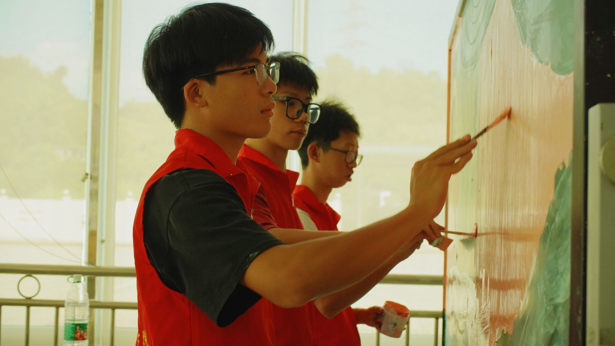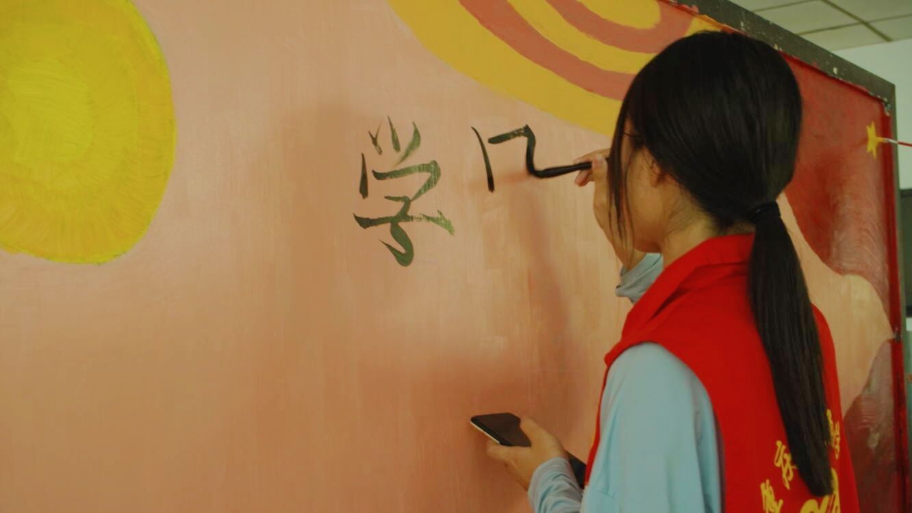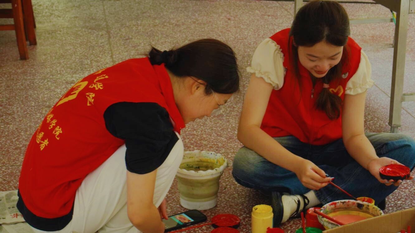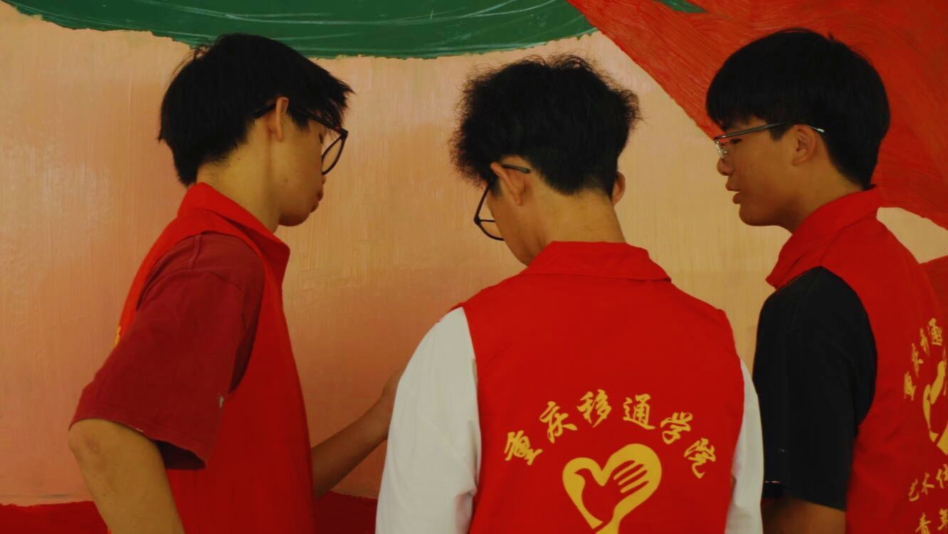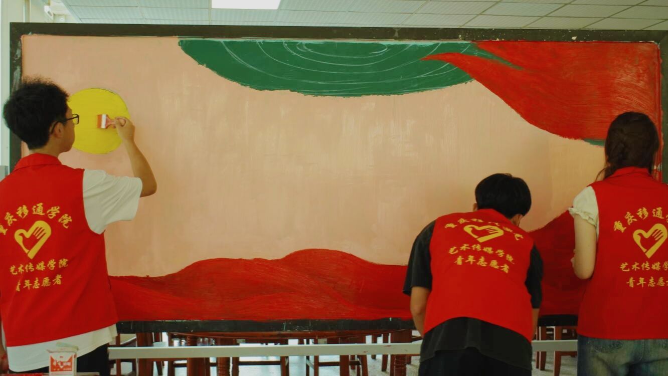 红日初生,其道大光,五星红旗熠熠生辉,志愿者的信仰万丈光芒。艺术传媒学院青年志愿者们在指导老师许静老师、主席的带领下,到达武警中队后,昂首挺胸,气质不菲的军人气质令志愿者肃立起敬。武警手上的武器正如志愿者们手里的画笔,一撇一捺皆是脊梁,一丝一念皆是未来,一文一墨皆是骄阳。打底、调色、刷底、细节勾勒,六名志愿者分工合作,井然有序,三分明讲,七分默契,有条不紊地进行着手中的任务,笔下的那一抹红,是志愿红不忘初心的续写。