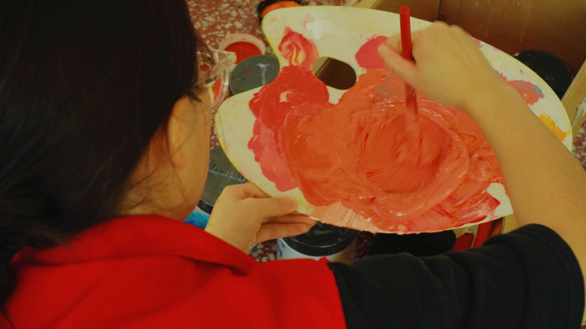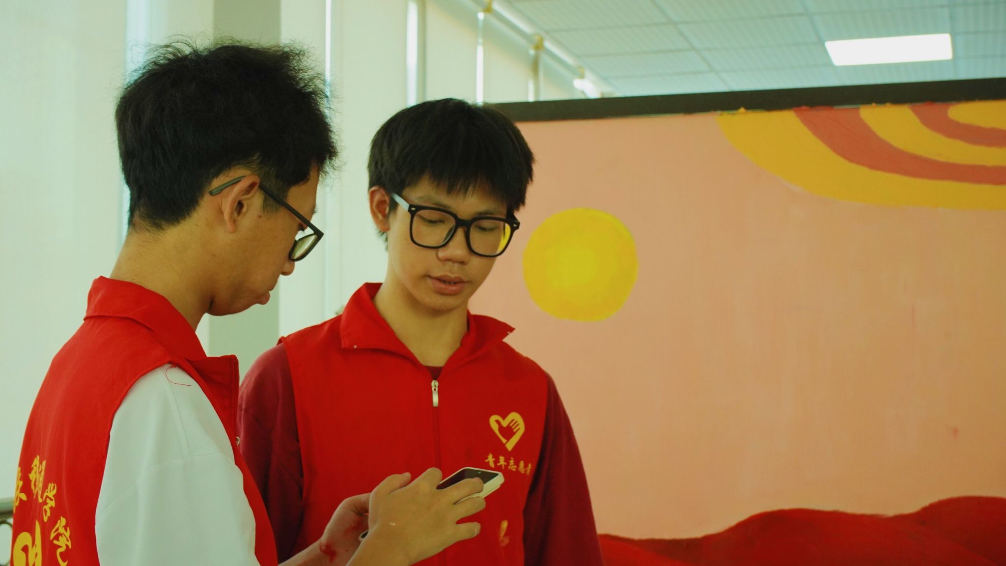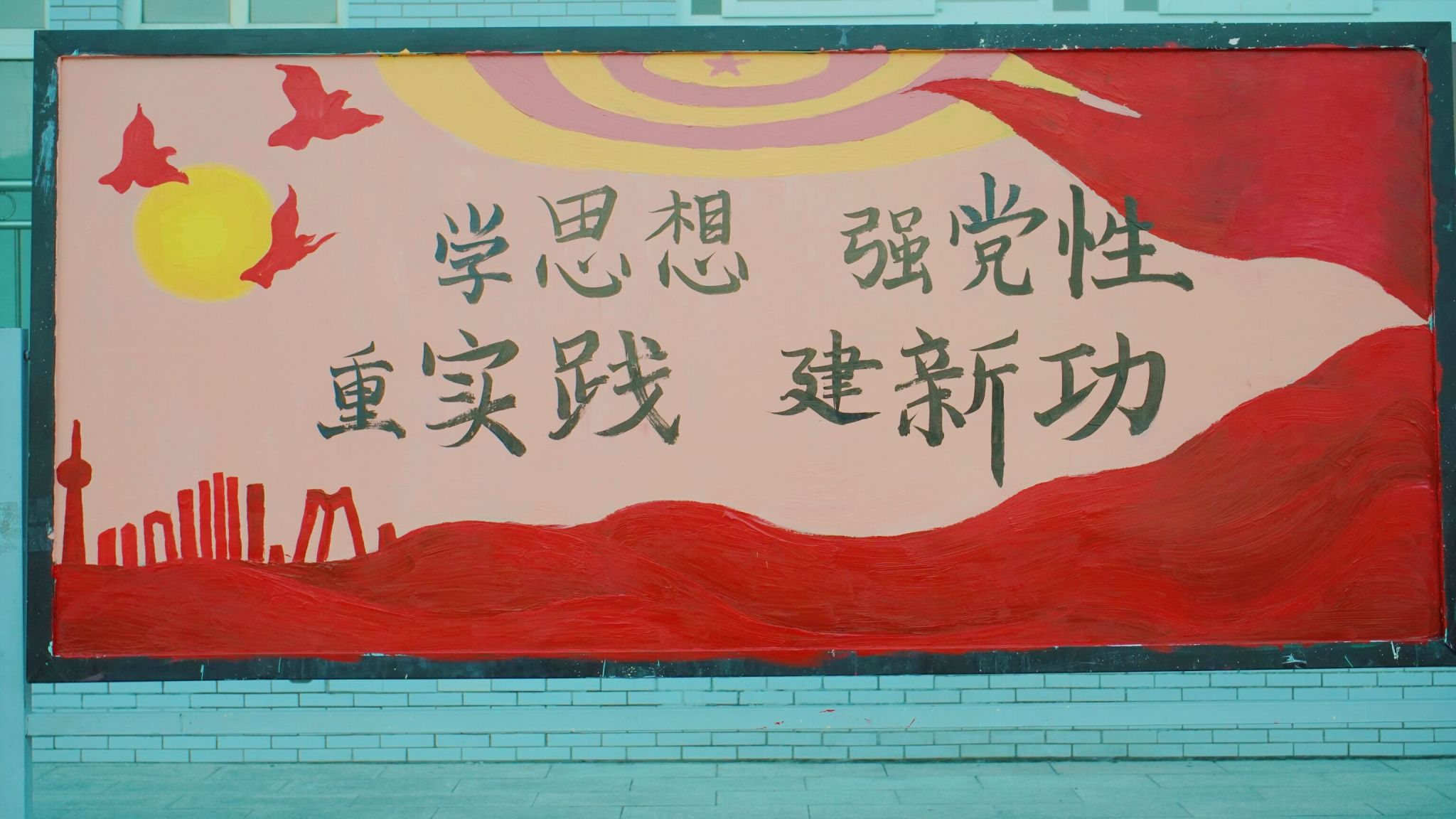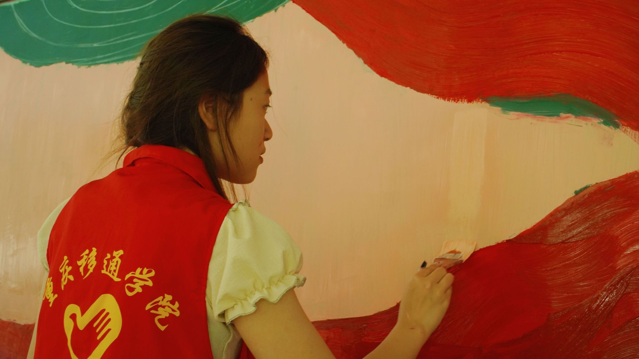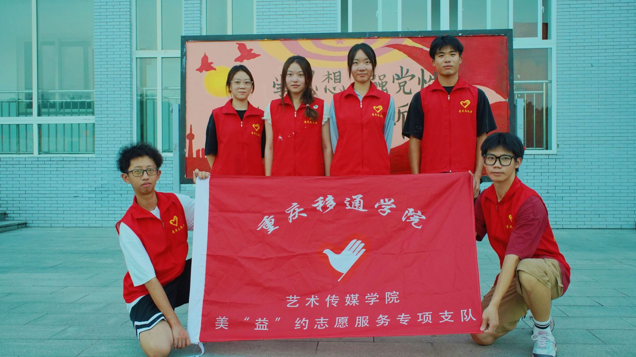 红日初生,其道大光,五星红旗熠熠生辉,志愿者的信仰万丈光芒。艺术传媒学院青年志愿者们在指导老师许静老师、主席的带领下,到达武警中队后,昂首挺胸,气质不菲的军人气质令志愿者肃立起敬。武警手上的武器正如志愿者们手里的画笔,一撇一捺皆是脊梁,一丝一念皆是未来,一文一墨皆是骄阳。打底、调色、刷底、细节勾勒,六名志愿者分工合作,井然有序,三分明讲,七分默契,有条不紊地进行着手中的任务,笔下的那一抹红,是志愿红不忘初心的续写。