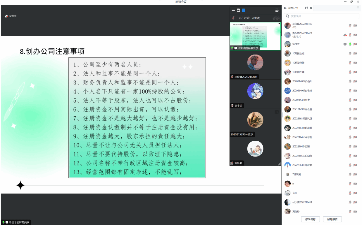 挑战是生活的常态,敢于做第一个吃螃蟹的人才能挑战成功,创业也是如此。汤老师讲解了在创业时要注意的重要事项和创业的基本流程,例如,成立个体工商户、申请营业执照、制定发展方案、选址、创立公司等。汤老师特别强调选址最为重要,只有选址好了才有资金为创业的稳健发展打好基垫。通过汤老师的讲解,同学们逐步了解了创业是怎样一个过程,需要面临什么样的挑战。
