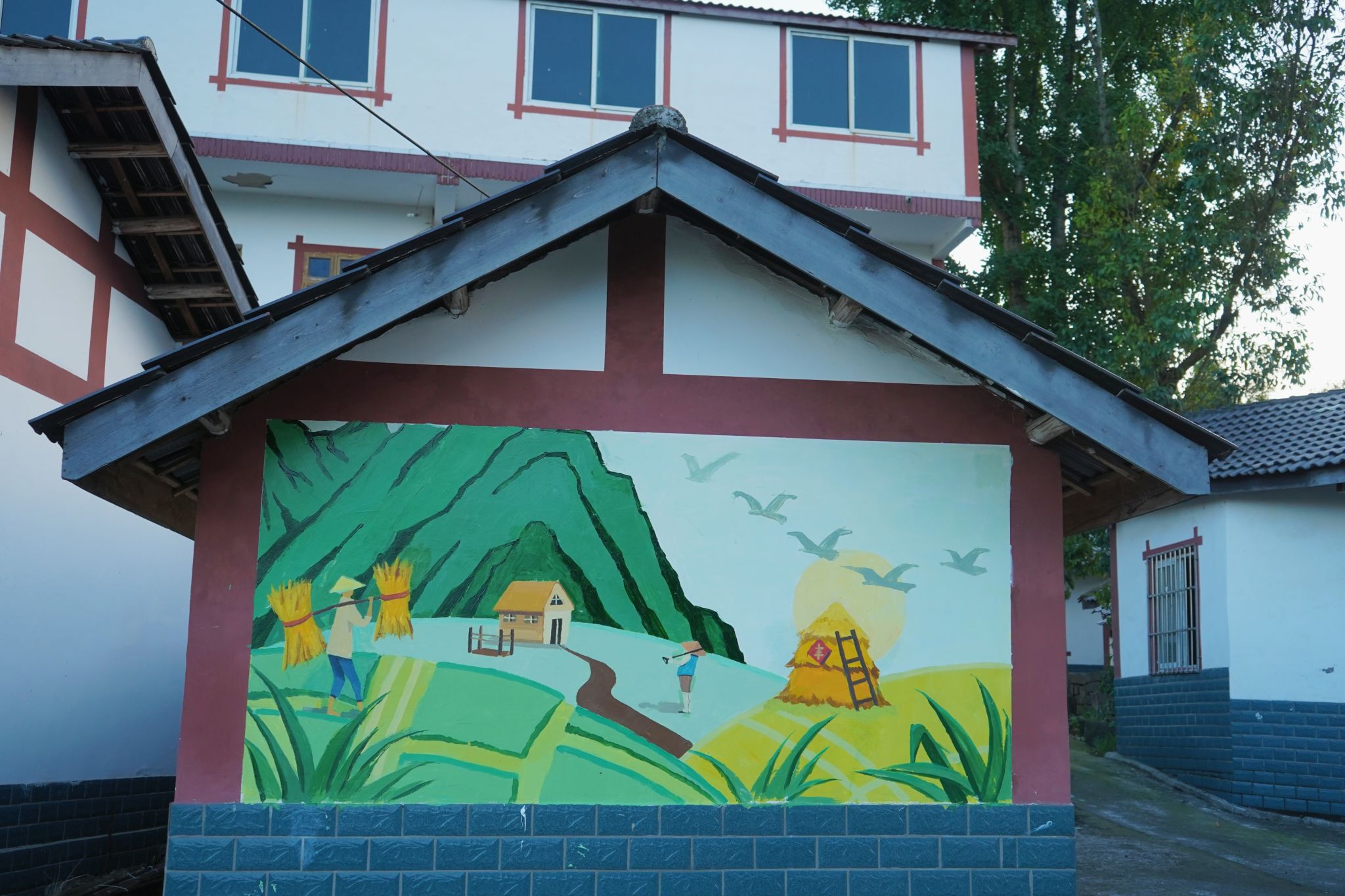 五彩斑斓的墙绘中,农民们日出而作,日落而息,绵延绿色的大山、曲折蜿蜒的小路、外出务农的农民、黄金丰满的稻穗都构成了一幅充满农村生活气息的宣传多彩墙绘。志愿者们设计墙绘的场景成为七星村一道亮丽的风景线,弯腰、抬臂、起手、落笔、上色,画笔在光影间跳跃,绘出了乡村的美丽天地,村民们纷纷驻足观看。墙绘作品不仅改善了村容村貌,也将艺术融入了乡村生活。
