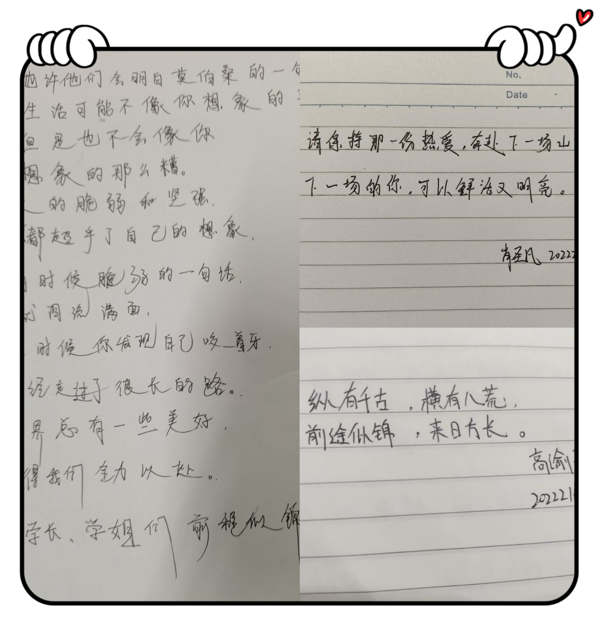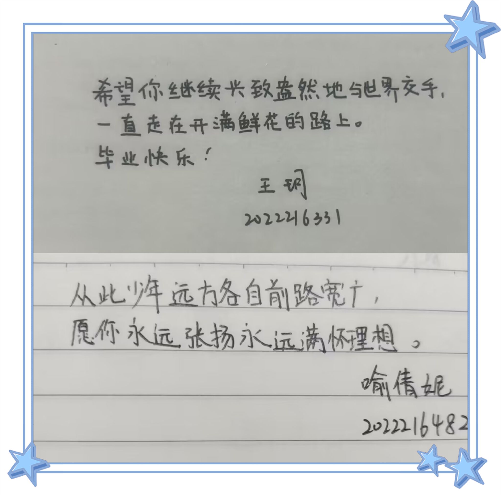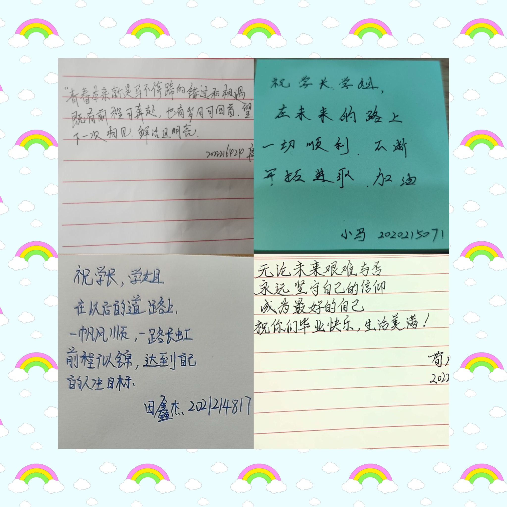 “无论未来艰苦与否,永远坚守自己的信仰,成为最好的自己,祝你们毕业快乐,生活美满!”这是2022级学生荀成刚同学写下的祝福,让我们一起共勉;“青春本来就是马不停蹄地错过和相遇,既有前程可奔赴,也有岁月可回首,望下一次相见,鲜活且明亮。”这是2022级学生段明宏写同学对青春的赞歌。青春是充满活力的,是充满幻想的。未来要靠自己去书写,去创造奇迹。这次“点缀青春,书写未来”毕业季主题活动是凝聚力的一次展现,是母校与青春的一页纸,让不同年级的同学们彼此建立了更多的联系。