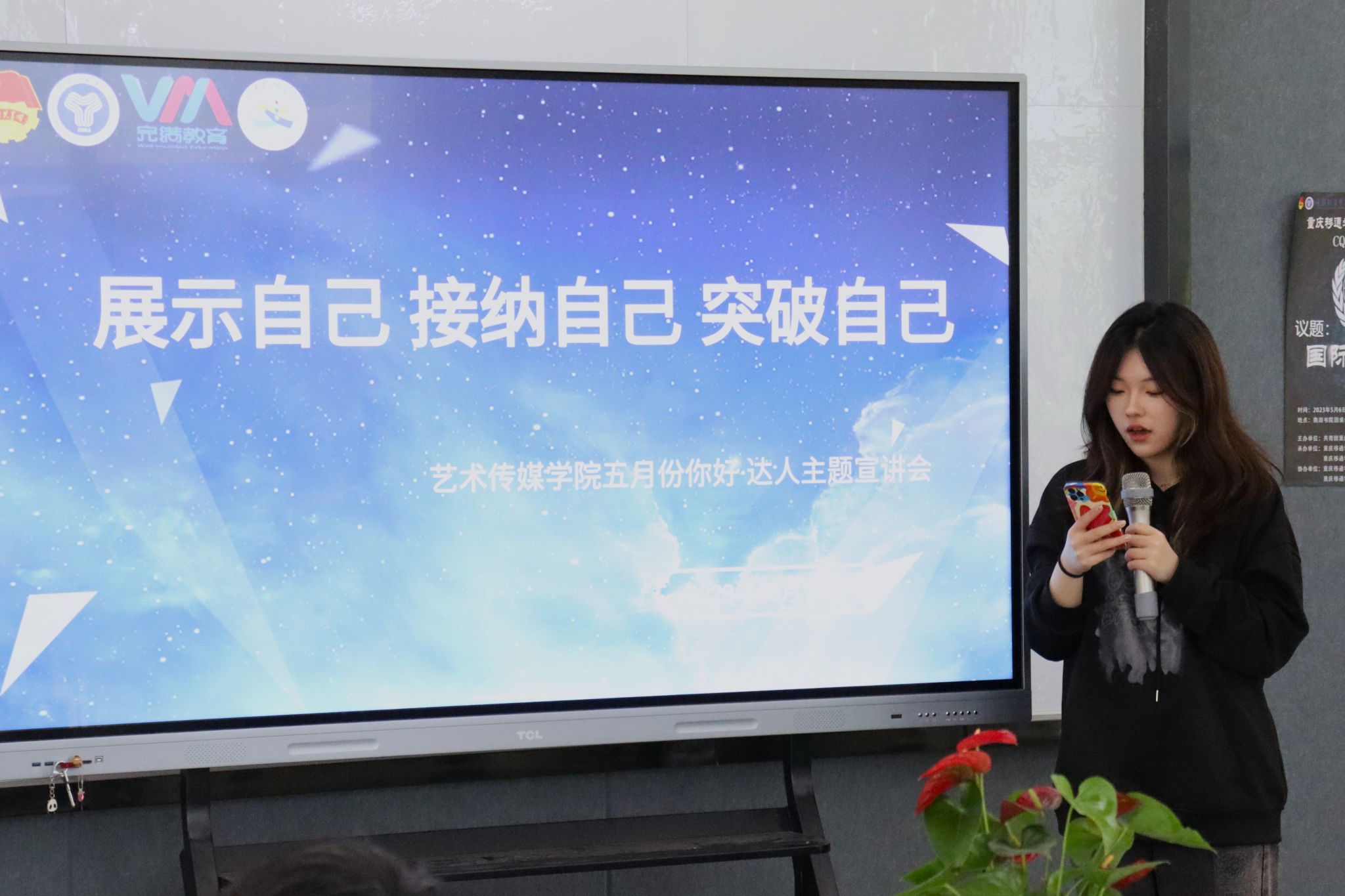 为了充分发挥学校优秀学生榜样作用,同时提升大学生自身能力,进一步做到学生引领学生,学生影响学生,号召同学们向优秀榜样看齐。艺术传媒学院团总支宣传调研部于2023年5月11日中午12时30分在南湖书院中德创意工坊开展“你好,达人”分享会,本次分享会邀请到艺术达人胡婉悦同学主讲。