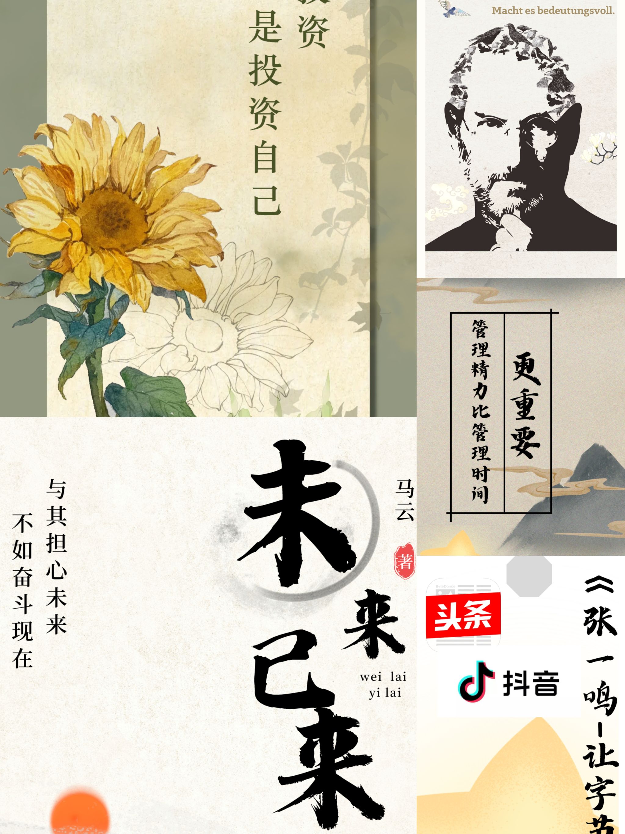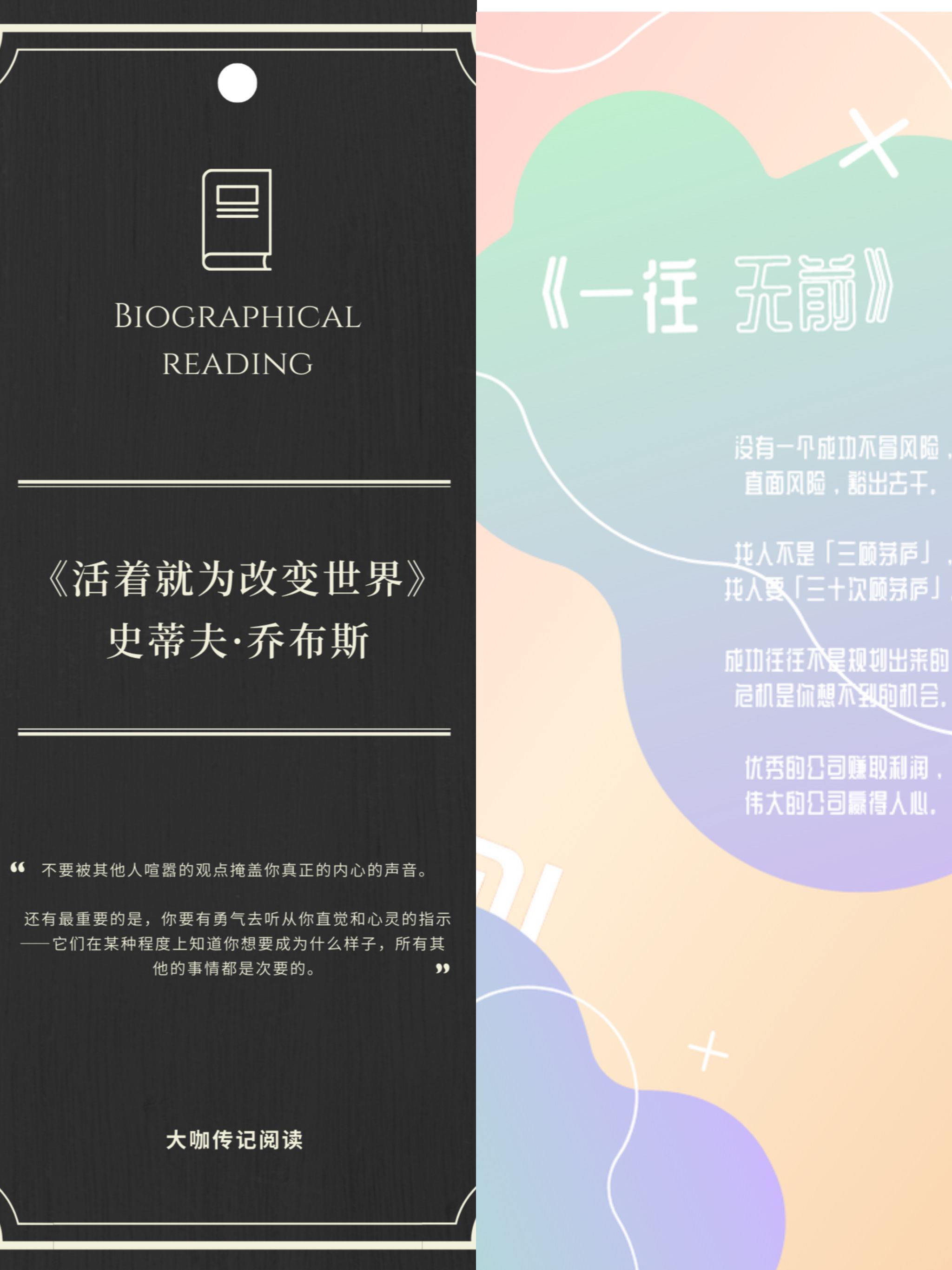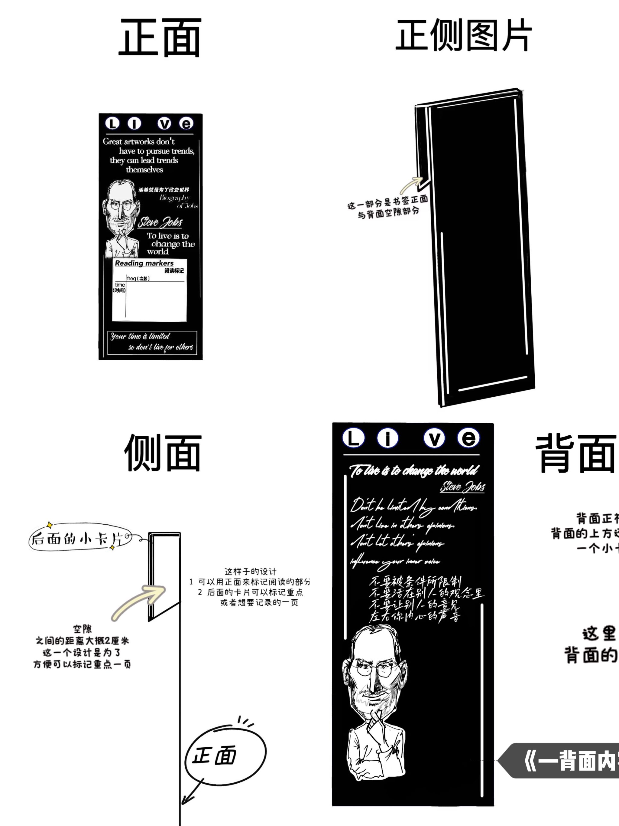 石双祺同学充分利用了书签前、后双面的反差,设计出不同风格的两面内容,既是乔布斯改变世界的冒险精神,也是雷军主动出击寻找机会的冒险精神;杨靖雨同学一定是字节跳动故事的忠实用户,像张一鸣那样创业也许是他的梦想哲学;裴欣瑜同学将设计与书签完美结合,巧妙运用立体思维,给予书签正面、背面、侧面四个维度的内容和设计,她的书签独具一格。