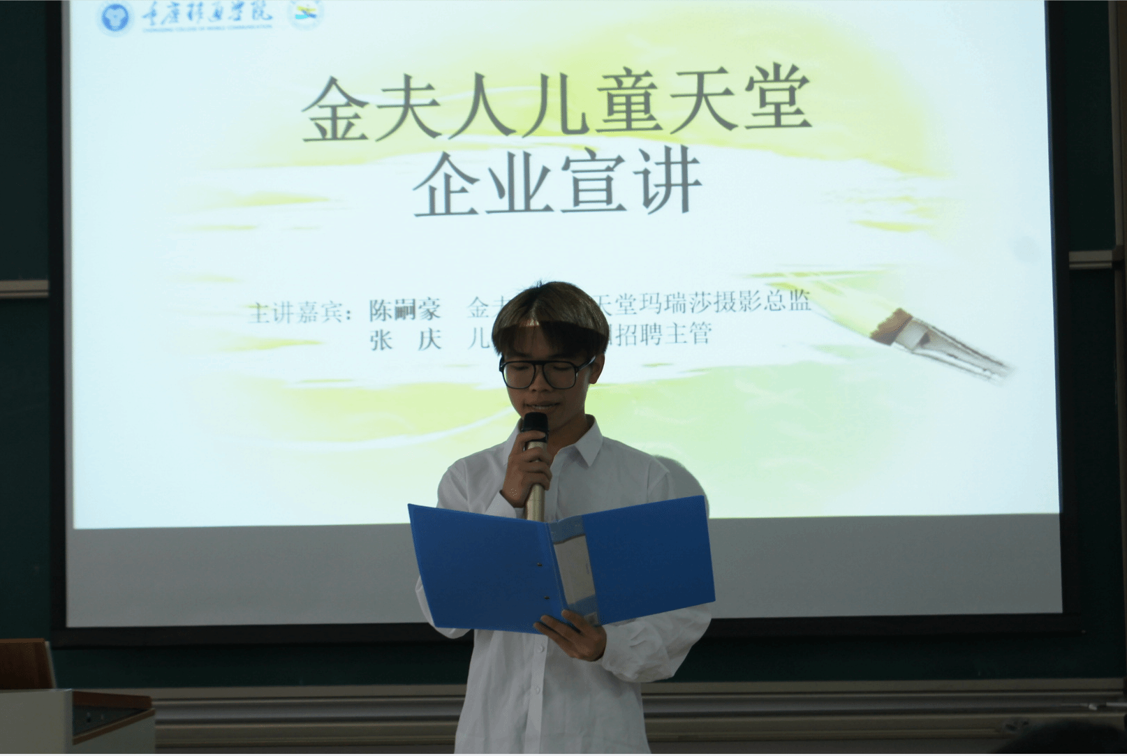 正值人间四月,2023年4月19日14:00,重庆移通学院艺术传媒学院举办了金夫人天堂儿童宣讲。这次活动有幸邀请金夫人儿童天堂玛瑞莎摄影总监陈嗣豪老师和儿童天堂校园招聘主管张庆老师同学们讲述怎么处理图片,以及拍照技巧背景的选取。本次活动参与人员共计180余人。