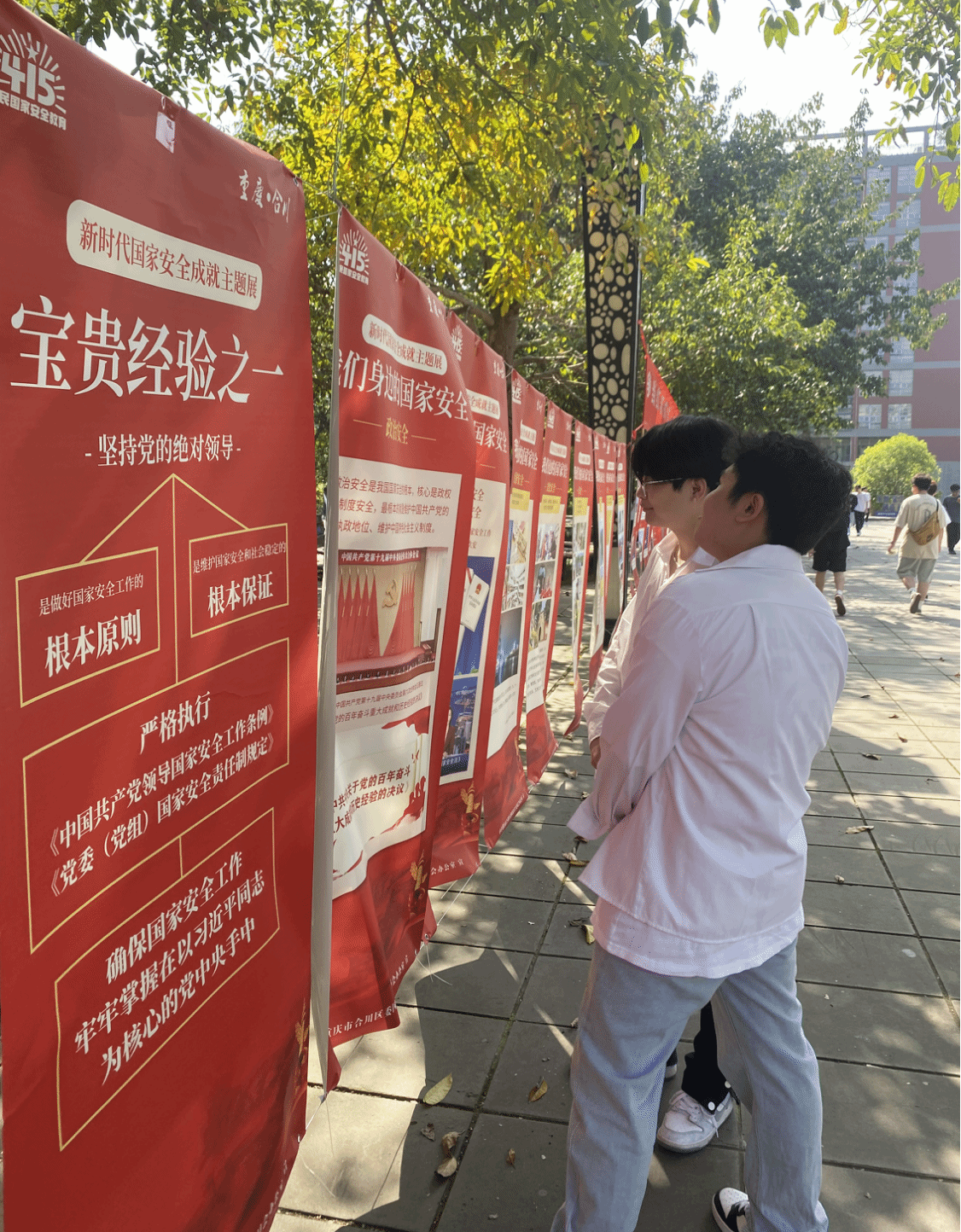 在学校的组织下,黄桷树广场设置了横幅和展板。展板上列出了我们的政治安全、太空安全、科技安全、深海安全等众多方面的安全,无一不体现出保证安全的前提是持党的绝对领导,确保国家安全工作牢牢掌握在以习近平同志为核心的党中央手里。