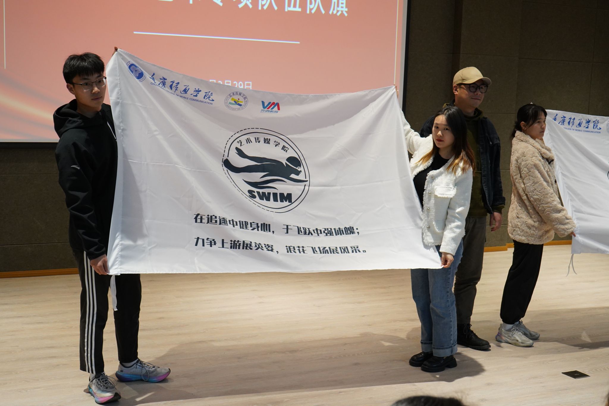队旗标志着一个队伍的成立,是一个队伍文化、精神的传承,由艺术教育中心邹贤达主任为学院体育、艺术专项队伍授予了旗帜。各队队长和副队长依次上台接过队旗并向大家展示。