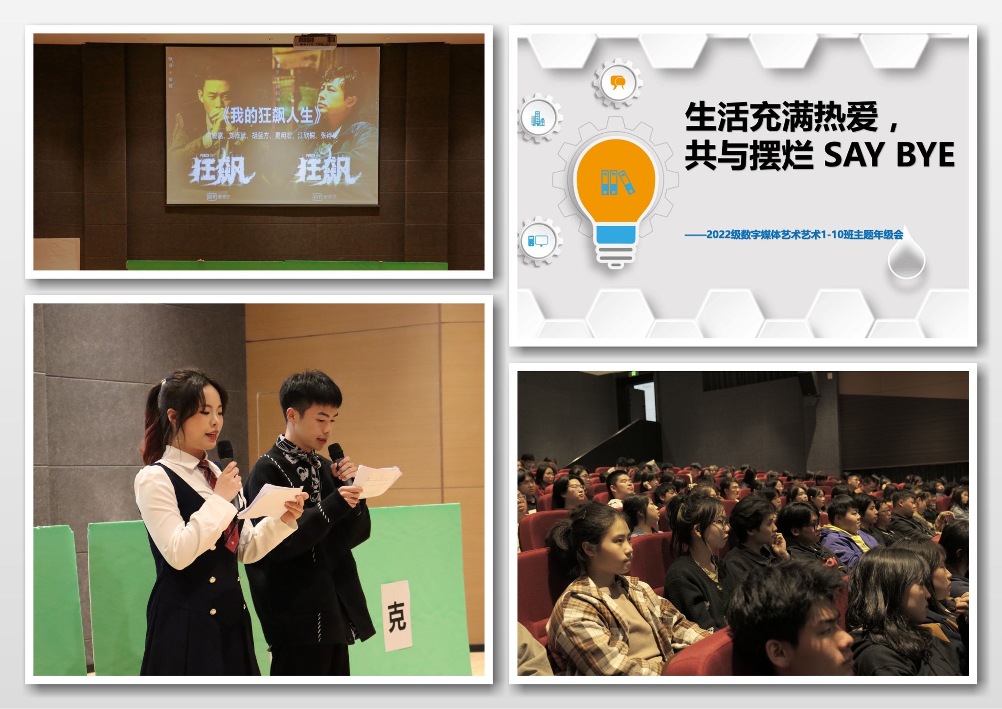 春风拂面,万物复苏。新学期已在有序地进行中,为进一步加强学风、班风建设,为让学生对校园制度有更加深入了解,于2023年3月22日18:00在六度空间105℃学术报告厅开展“生活充满热爱,共与摆烂SAY BYE”主题年级会,年级会以情景剧《我的狂飙人生》贯穿始终,通过学生第一视角来解读校园规章制度。本次年级会与学工、教工、竞技体育中心多方合作,邀请到数字媒体艺术教研室主任廖国臣老师、竞技体育中心校女子游泳队教练王钰涵老师和辅导员胡磊老师来为同学们做制度讲解,2022级数字媒体艺术1-10班全体学生参会。