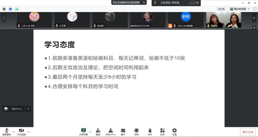 邓佳琦学姐和黄仪学姐向同学们展示了考研时期的作品,并且向同学们分析了现当下的考研现状,通过艺术学专硕总分国家线趋势图,清晰的看见现在考研热度不断上升的趋势,分析了“考研是为了什么”。介绍考研的细节和学习方式,建议同学们“前期多准备英语和绘画科目,后期理论,确保每天至少8小时学习,合理安排学习时间”来寻找适合自己的学习方法。