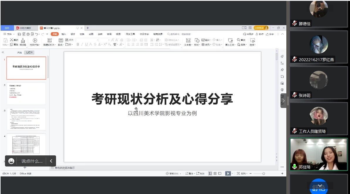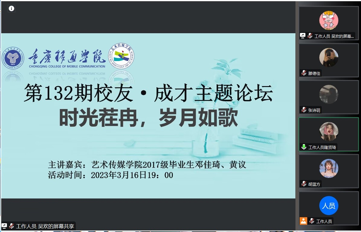 考研成为了大学生提升个人学历、加强专业能力的不二之选。大一、大二学生想要了解更多的考研信息,同时进一步帮助大三、大四学生明确考研目标,增加学生考研信心,提高对考研的综合性认识。2023年3月16日19:00,由重庆移通学院就业创业指导与服务中心主办,艺术传媒学院协办的第132期校友·成才主题论坛“时光荏苒,岁月如歌”交流分享会在腾讯会议召开。此次活动有幸邀请艺术传媒学院2017级毕业生邓佳琦学姐和黄仪学姐为以四川美术学院为例向同学们分享考研现状和他们的考研心得。