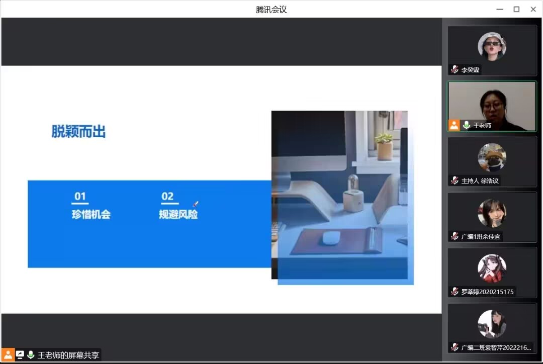 活动伊始,王老师向同学们解释了“脱颖未出”的含义,她认为现在的大学生不论就业还是创业,都应该根据自身的综合情况来考量,选择适合自己的工作,对未来不要迷茫,不盲目跟从,确定好目标就向着目标前进。