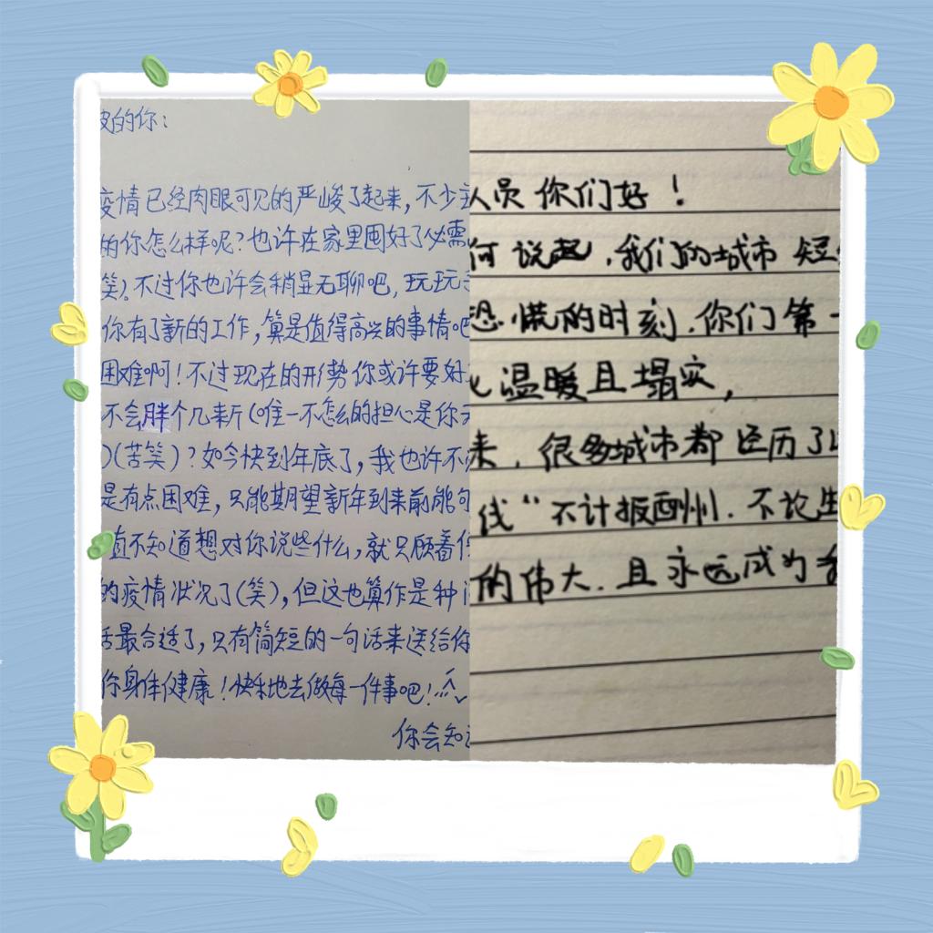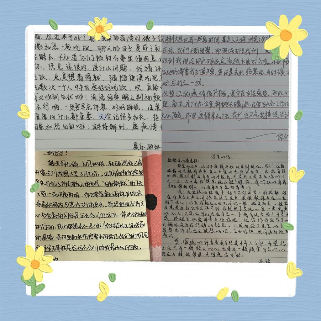 在本次活动共收到230余份手写“情书”,艺术传媒学院的同学们伏案笔耕,在白纸上表达出浓厚的情感,诉说着无限的爱意。他们用书信表达对她的亲切问候,他们用笔为全校师生筑下坚实的精神堡垒,一起用爱掌舵向彼岸起航。