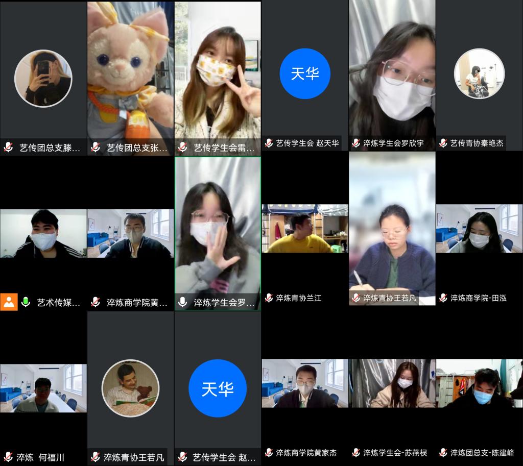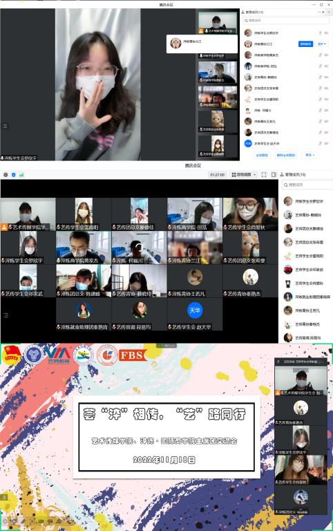 2022年11月18日下午两点,淬炼·国际商学院与艺术传媒学院在腾讯会议开展线上“荟“淬”相传,“艺”路同行”主席团交流会,共17人参与本次会议,交流主题为“传递责任,表达态度”。
