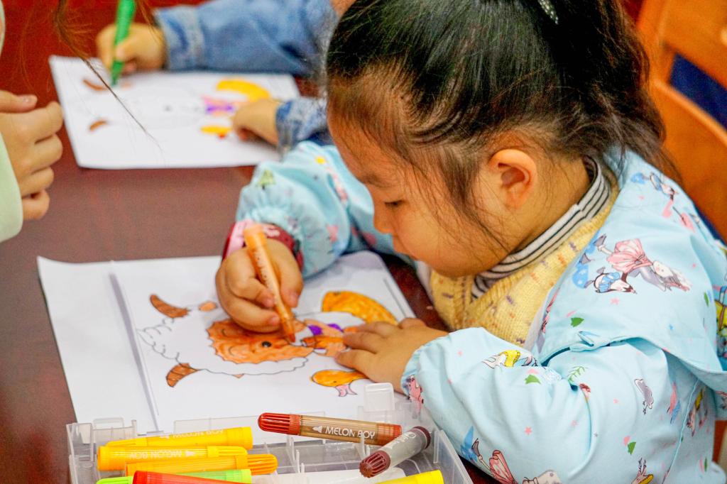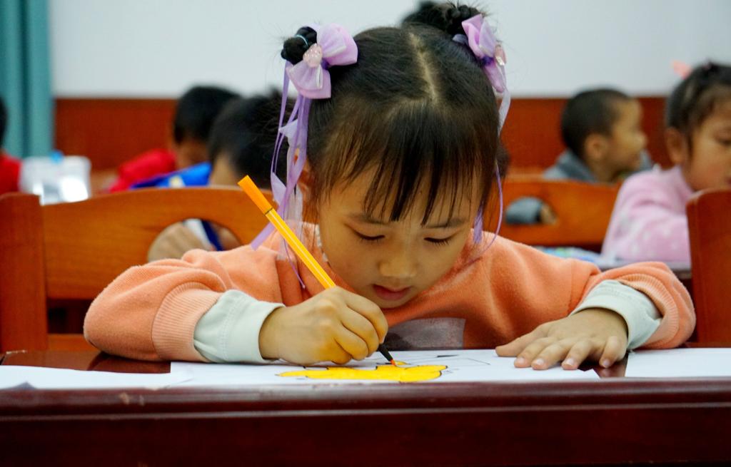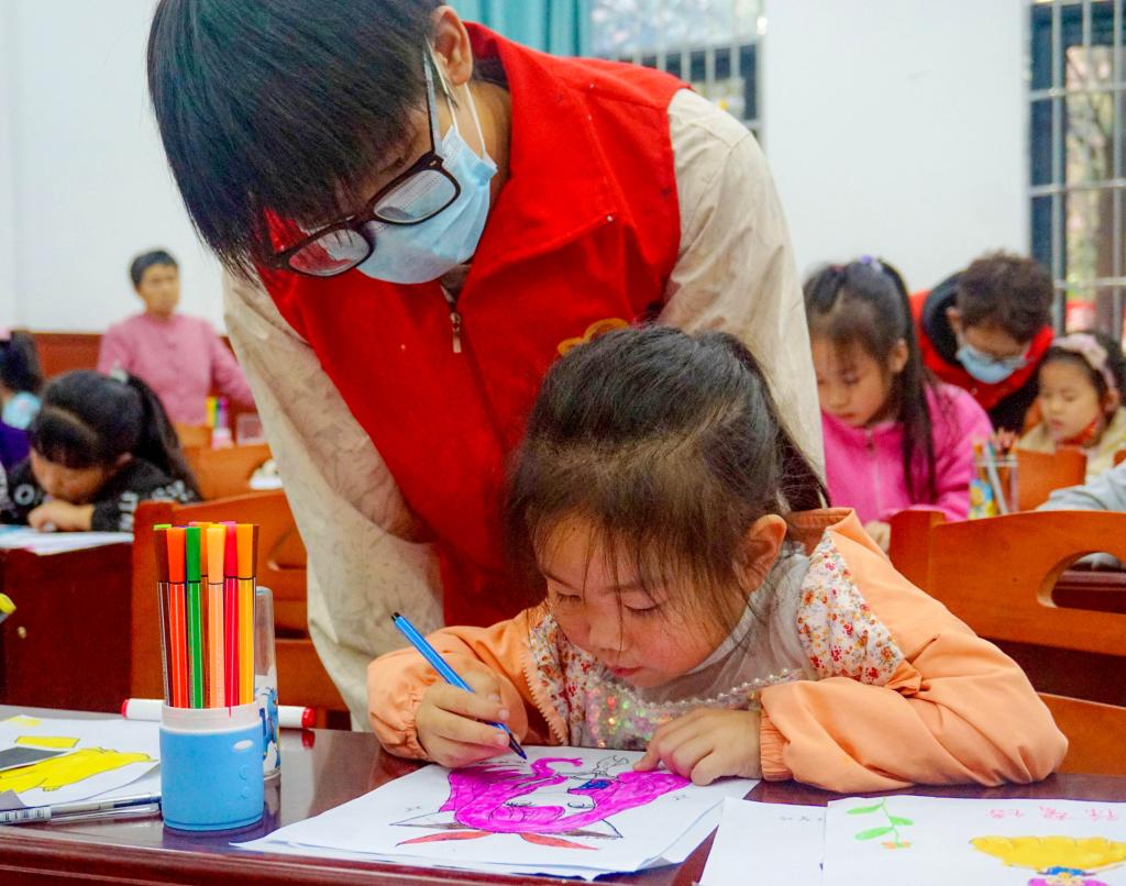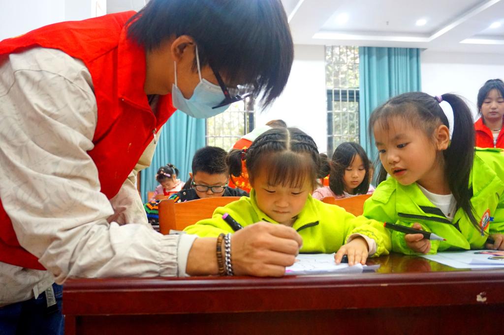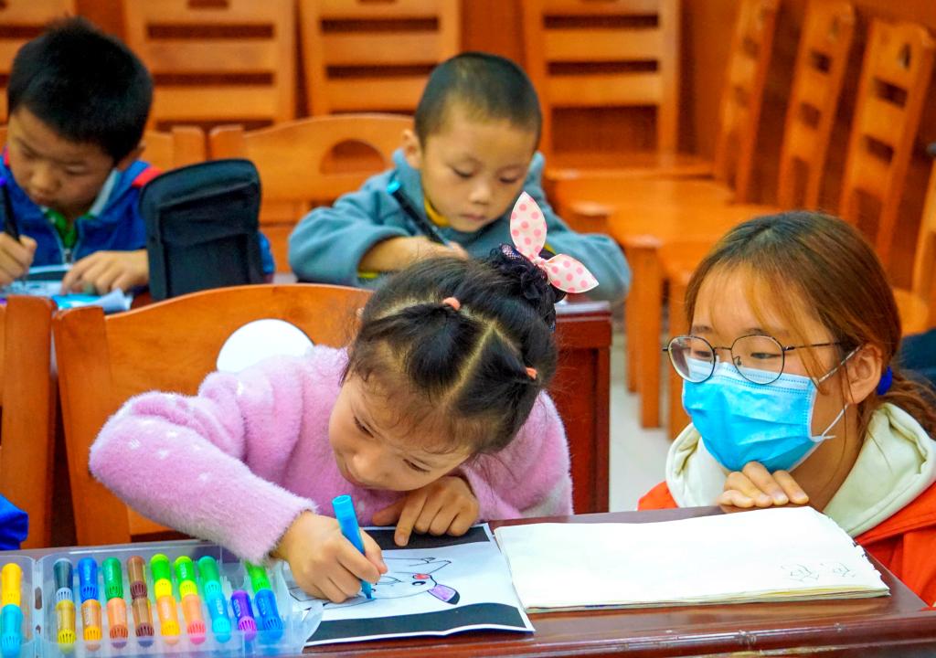 翻山越岭只为一场遇见,全力以赴只为一次改变。课堂上,一件件身着红色志愿服的小老师们与小朋友们积极互动,为他们讲解绘画色彩搭配知识。欢声笑语中,小朋友们将自己对世界的理解展现在一张张画纸上。孩子们天真烂漫地在画纸上勾画出图案,每一笔色彩都涂写了他们眼中的美景和独特的心灵感受。