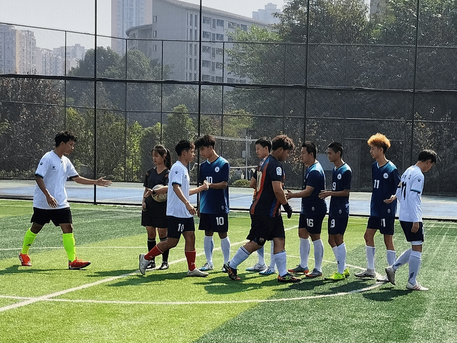 我院球员积极拼抢,创造了几脚很有威胁的射门,只可惜最后没能顺利转化为得分。最终,上半场随着裁判的一声哨声后,我院以0:1暂时落后。中场休息之余,球员们及时开展了战术安排及人员结构调整。