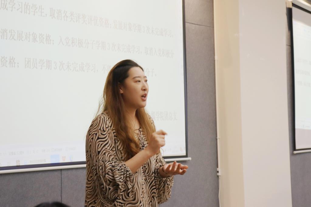 学习新思想,争做新青年。艺术传媒学院团总支书记安珈璇老师给大家说明我院青年大学习的考核制度,鼓励各团支书积极组织带领班级同学参与学习。安珈璇老师还强调了团支书的重要性,作为一个班级的团务管理者,在管理的同时,更应该修身克己,团支书优秀与否,既取决于个人能力,也在于班级整体氛围、更基于班级成员的勠力同心。