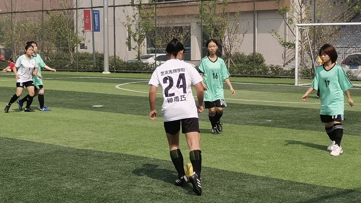 2022年10月18日中午,2022-2023学年“新生杯”足球赛艺术传媒学院与数字经济与信息管理学院女足比赛在D区足球场顺利展开。