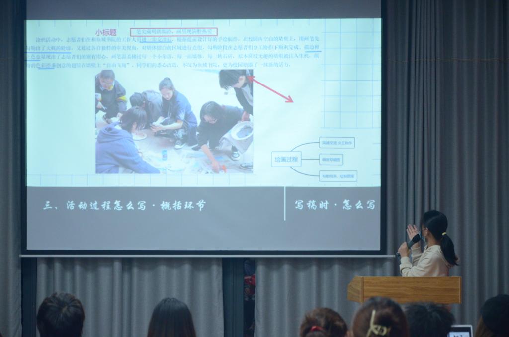会上为让干事们更熟练掌握培训内容,社会实践部采取“理论+实践”的现场演示宣讲形式办公室采取细致+生动”图片形式展现,图片标注清楚,原本枯燥的培训内容生动鲜活的展现出来。宣传调研案例+方法”的培训方式开展,讲解、演示实用技能,让干事们能尽快掌握志愿服务必备技能,提高工作质量与效率,更深层次的了解志愿服务常识、明晰志愿服务要求。