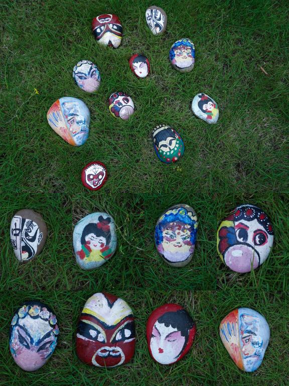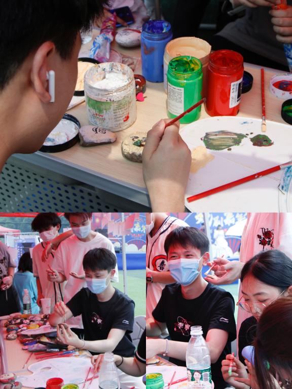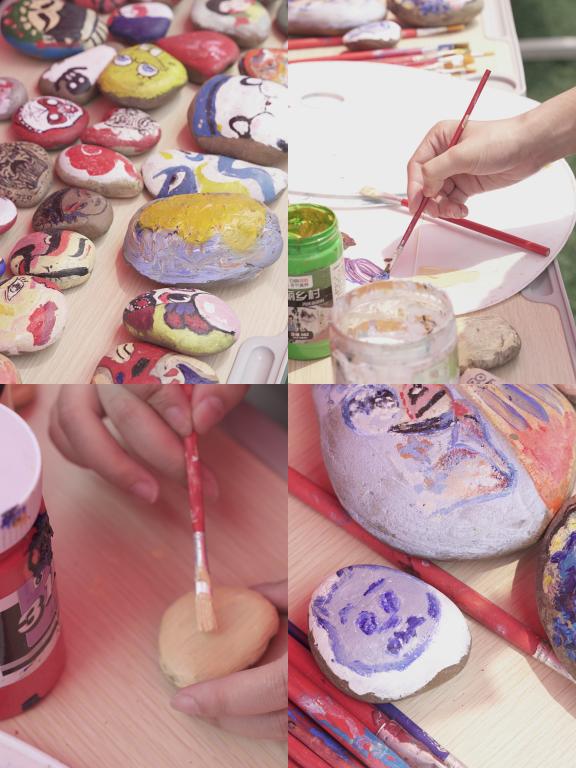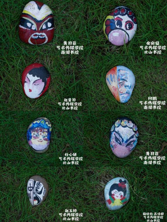 接下来,同学们尽情发挥出自己的想象力,将无限的创意和许多奇思妙想运用到这一颗颗朴实无华的石头上,平平无奇的鹅卵石上,却用色彩添上了一笔不可否认的戏剧故事,让其色彩斑斓,富有生命。大小不一的石头上有画脸谱的,五颜六色的脸谱,丰富多彩的表情,更加彰显川剧的魅力!新奇的人物,风景,西游记的“孙悟空”,漫画里的“龙猫”一个个跃然于石头上,仿佛成为了一件件艺术品,这些石头不仅是同学们辛苦创作的心血,同时也被寄于无限的期望,赋予了其新的意义。在烈日下,每一颗石头上都代表着不同的戏剧故事,色彩斑斓的鹅卵石给第九届“名角杯”大学生戏剧节外围活动增添了一番别具一格的场景,也让热爱戏剧文化的同学们,展示属于自己不同的戏剧舞台。