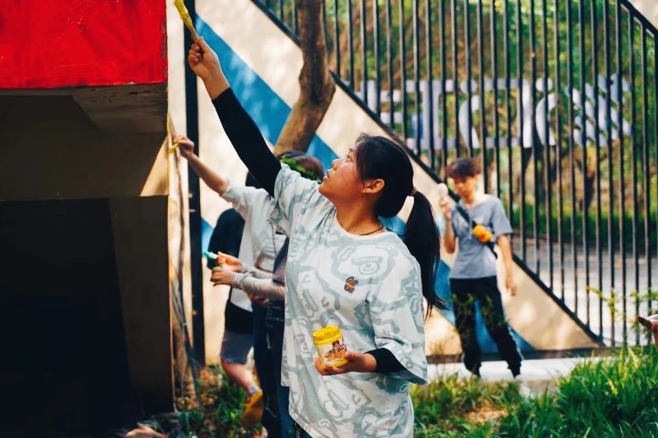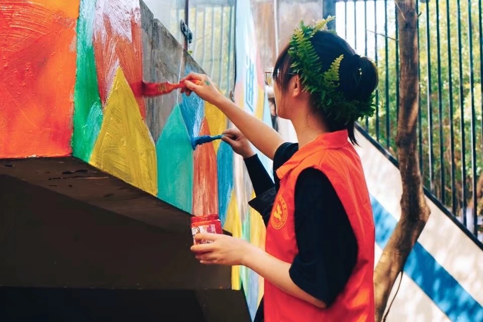 志愿者们调制画盘中的颜料,挥舞着手中的笔墨,仔细地勾画着墙面每一个轮廓,志愿者们用这种方式传递积极向上的思想、表达热烈活泼的情感,全身心投入到美化校园之中。炎炎夏日,志愿者们头顶着骄阳,挥洒着汗水,用手中的画笔勾勒出一幅幅生动活泼、精彩夺目的墙体画,得到了周围路过同学们的一致称赞。