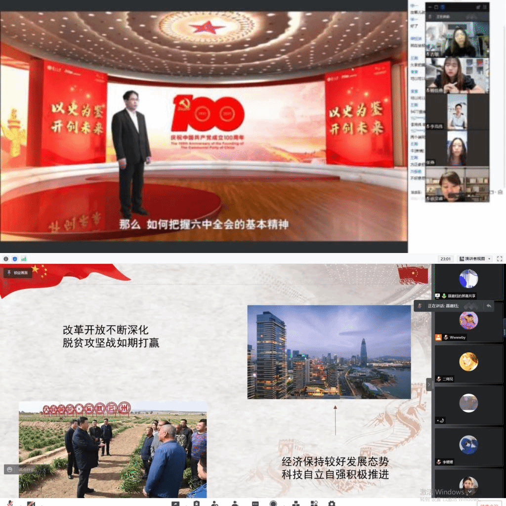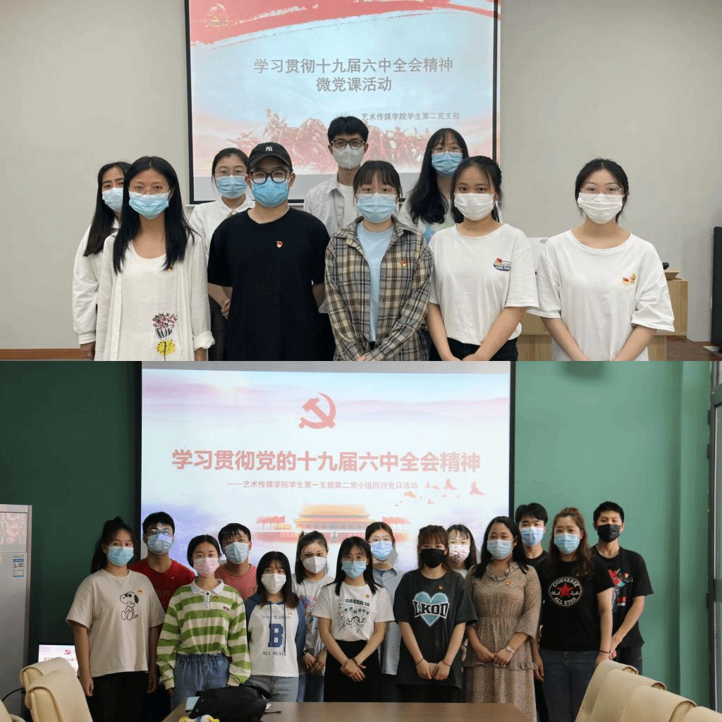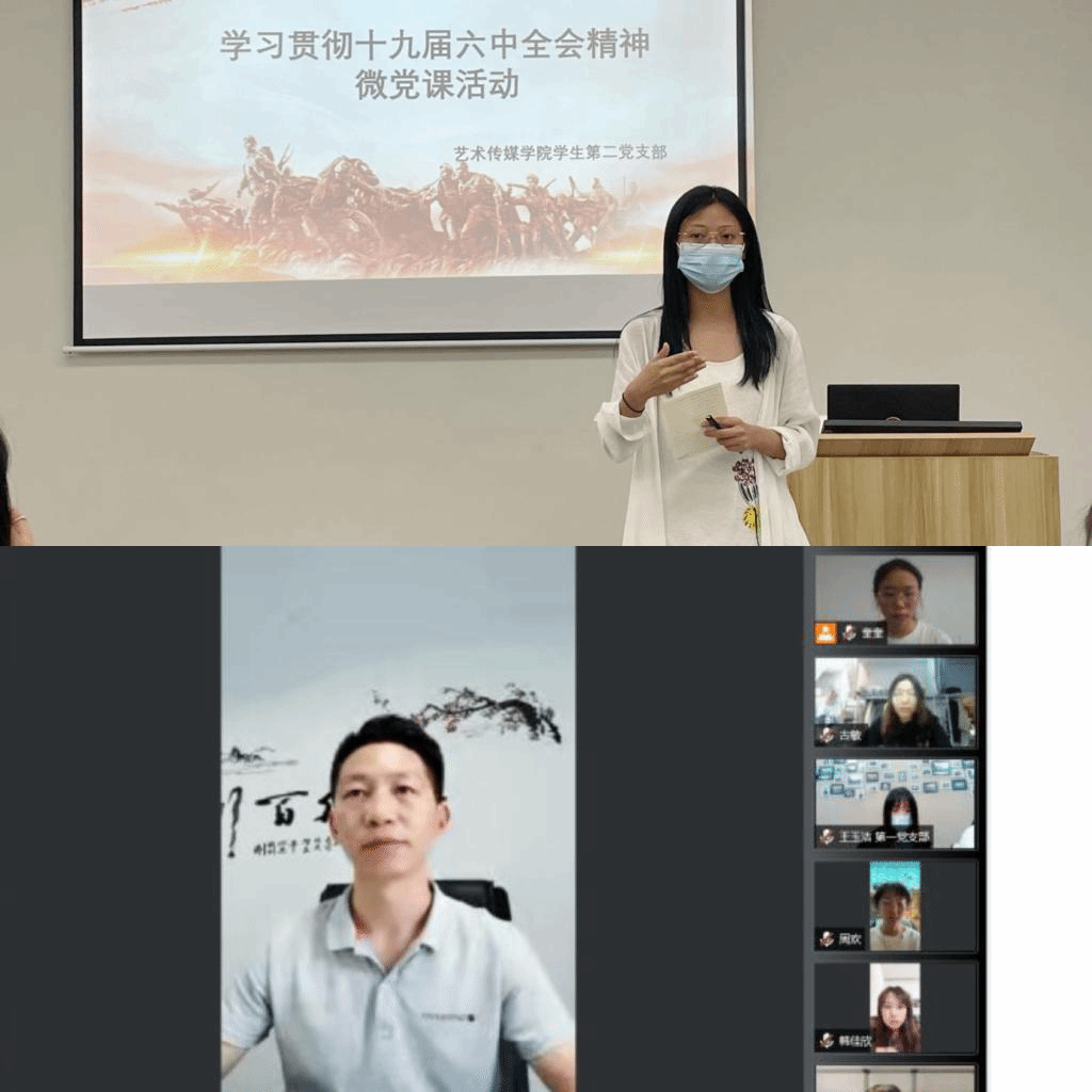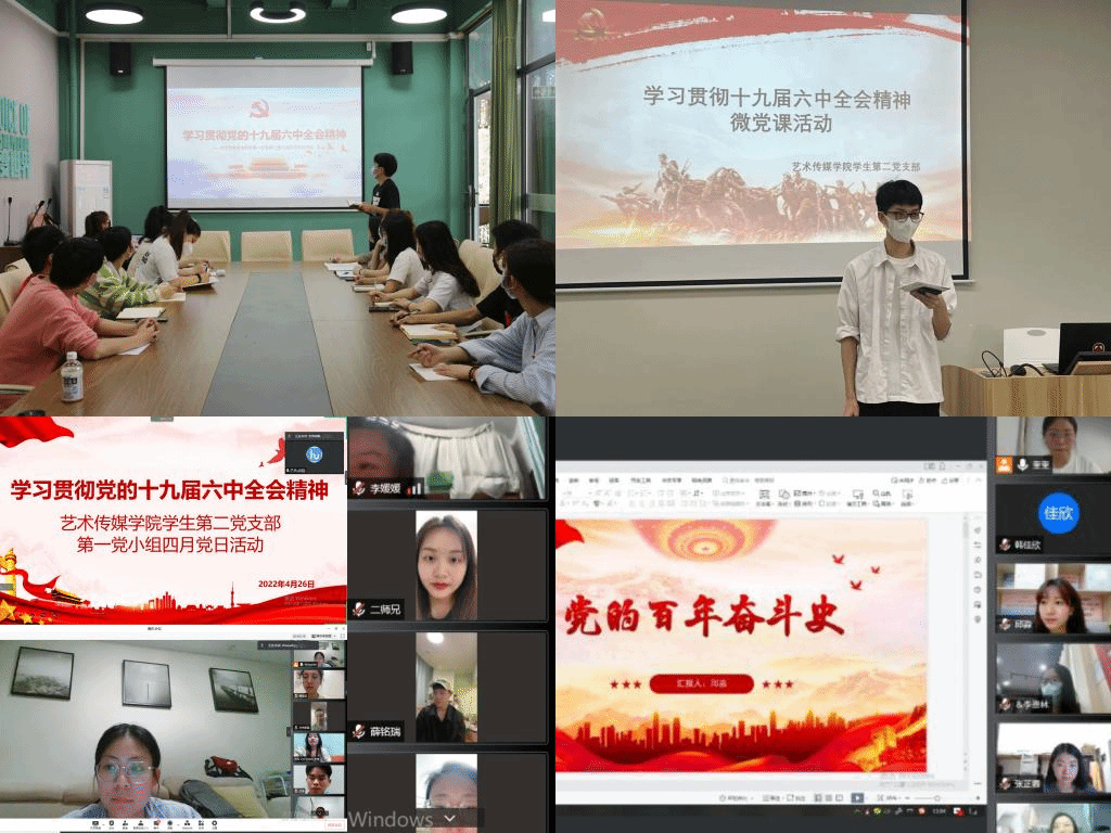 百年征程波澜壮阔,百年奋斗成就辉煌。党的十九届六中全会从党和国家事业发展的战略全局出发,深入研究党领导人民进行革命、建设、改革的百年历程,为进一步增强支部党员的“四个意识”,提高党员的思想站位,提升政治理论水平,艺术传媒学院学生第一、第二党支部四个党小组分别于2022年4月26日通过线上、线下的形式开展学习贯彻十九届六中全会精神的微党课活动。