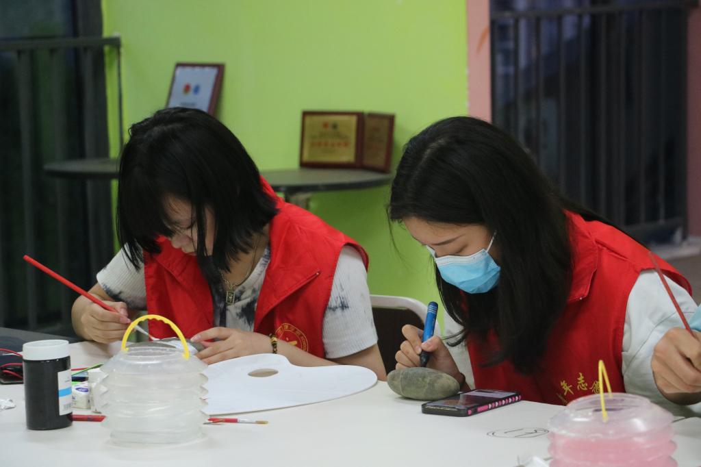 这期活动与往常有些许不同,夜幕将至,学生社团活动中心室却灯光通明,九名志愿者围靠在桌前,手持画笔,在一块块手掌般大小的石头上绘制着歌颂祖国的红色图案。在大家心目中,虽然关于祖国美的方面各有不同,但每个人无不充满敬意,有的志愿者描摹的是红船,有的志愿者刻印的是国旗党旗,以中国红为主的颜色就是志愿者们眼中最美丽的颜色。