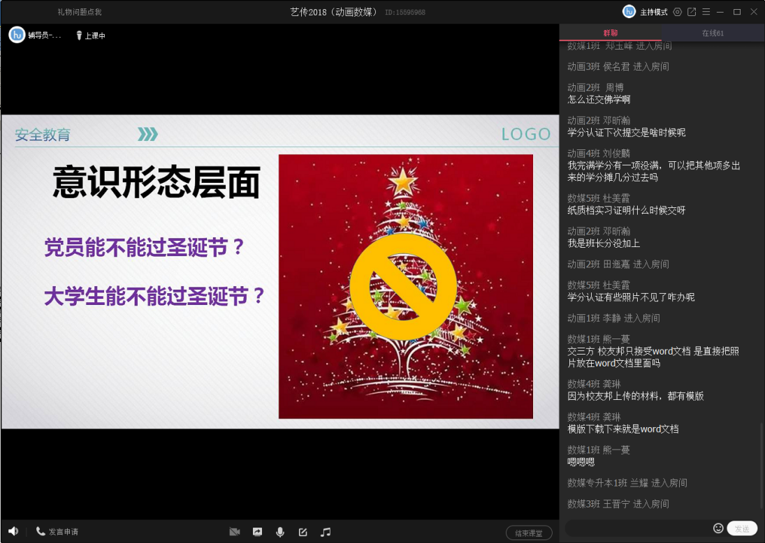 年级会最后的安全教育环节,从意识形态层面回答了“党员能不能过圣诞节”、“大学生能不能过圣诞节”两个问题,引导同学们崇尚科学文明、追求社会进步的责任。