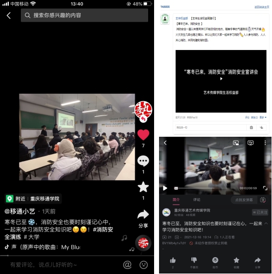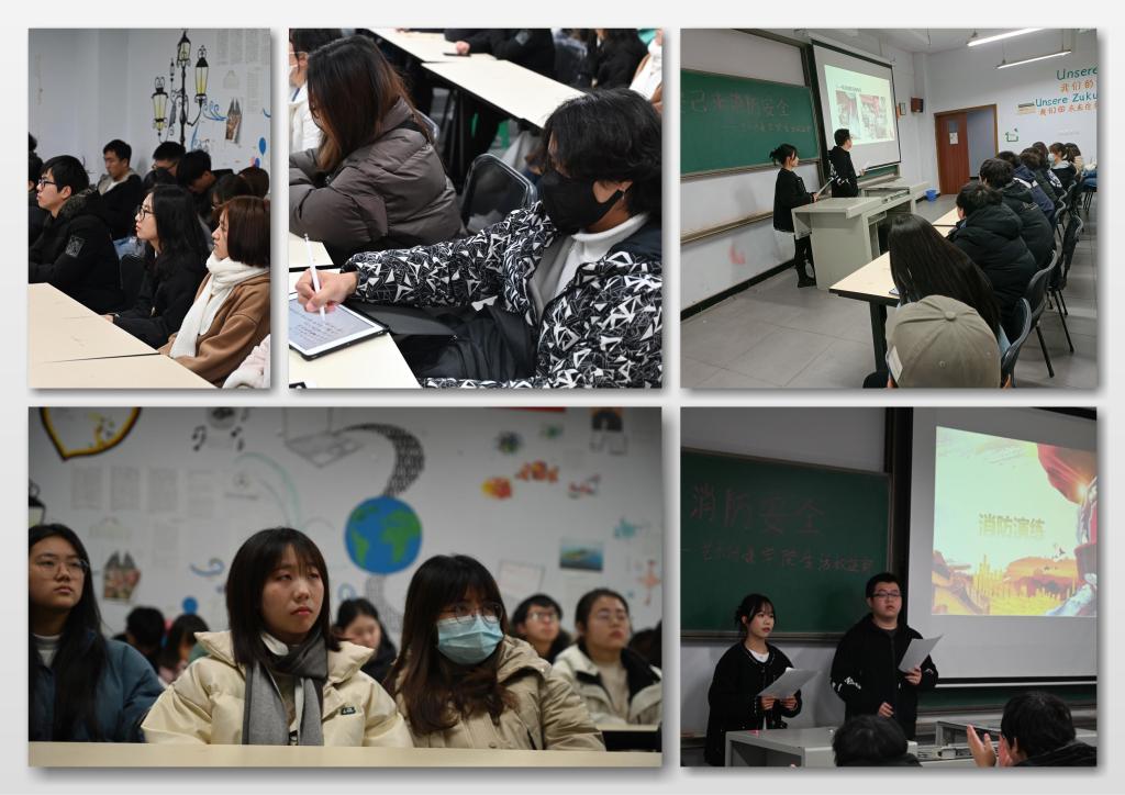 通过消防知识的学习后,进入逃生演练环节。当紧张的火警笛声响起,同学们迅速有序逃离现场,做到“不慌张不拥挤,捂住鼻子防烟熏,安全出口墙脚认,通道出口勿堵住。”的火灾逃生口决,很好的将所学知识应用于实践。为了更好更全面的做好消防知识宣传,院学生会的同学们还专门录制了消防宣传小视频,在QQ空间、抖音、B站等媒体平台上传播推广,得到了老师和同学们的点赞和转发,反响良好。