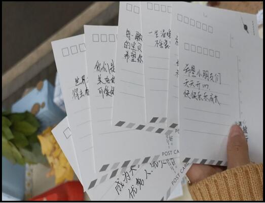 12月9日,21122107支部的同学们在B区操场旁置了自助小摊点,小小的自助摊点却饱含着的是21122107支部同学们对留守儿童的关爱。一张张明信片寄托着同学们对留守儿童的祝福。爱,要行动;暖,要暖心,每一位同学都期待那些孩子在收到自己的祝福以后能够感受到这份独属于他们的温情。大家奉献出自己的一份爱心,或许这些孩子们的冬天就会不一样了吧!