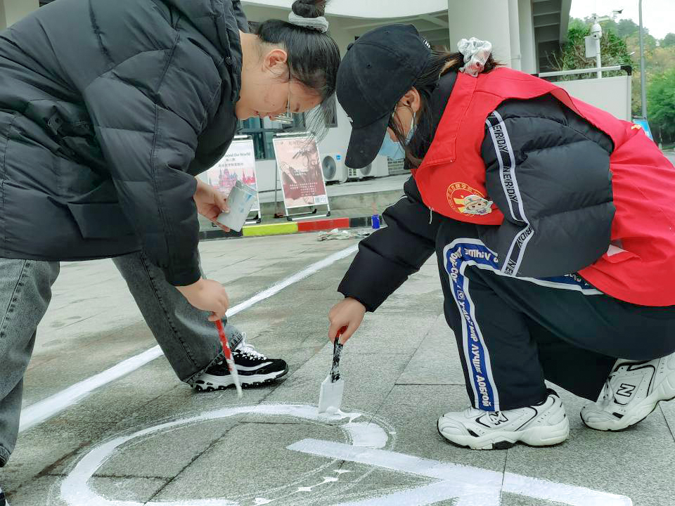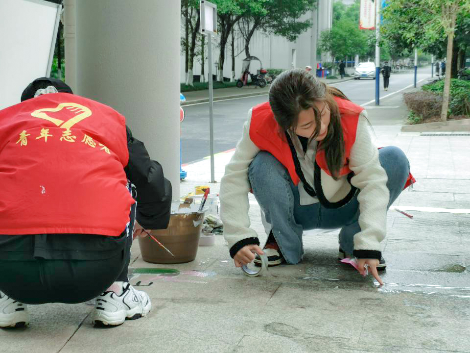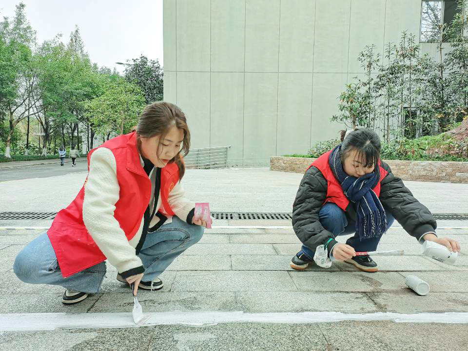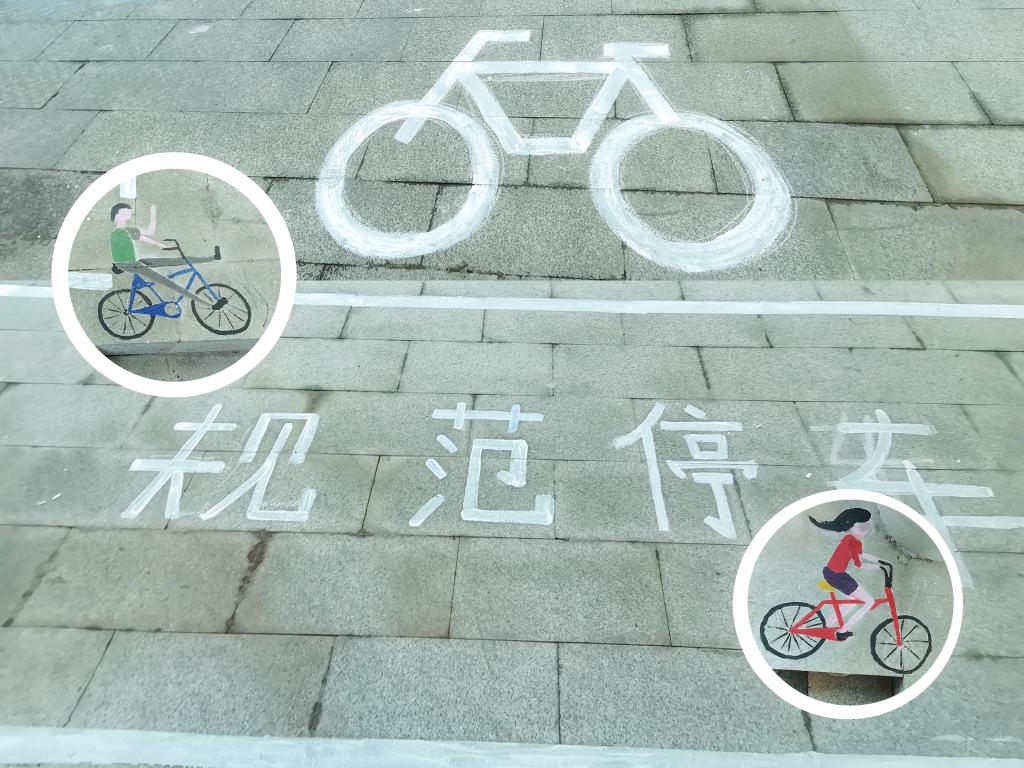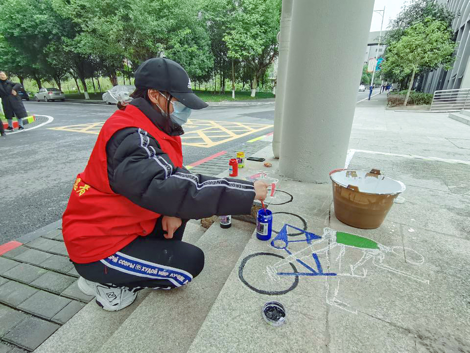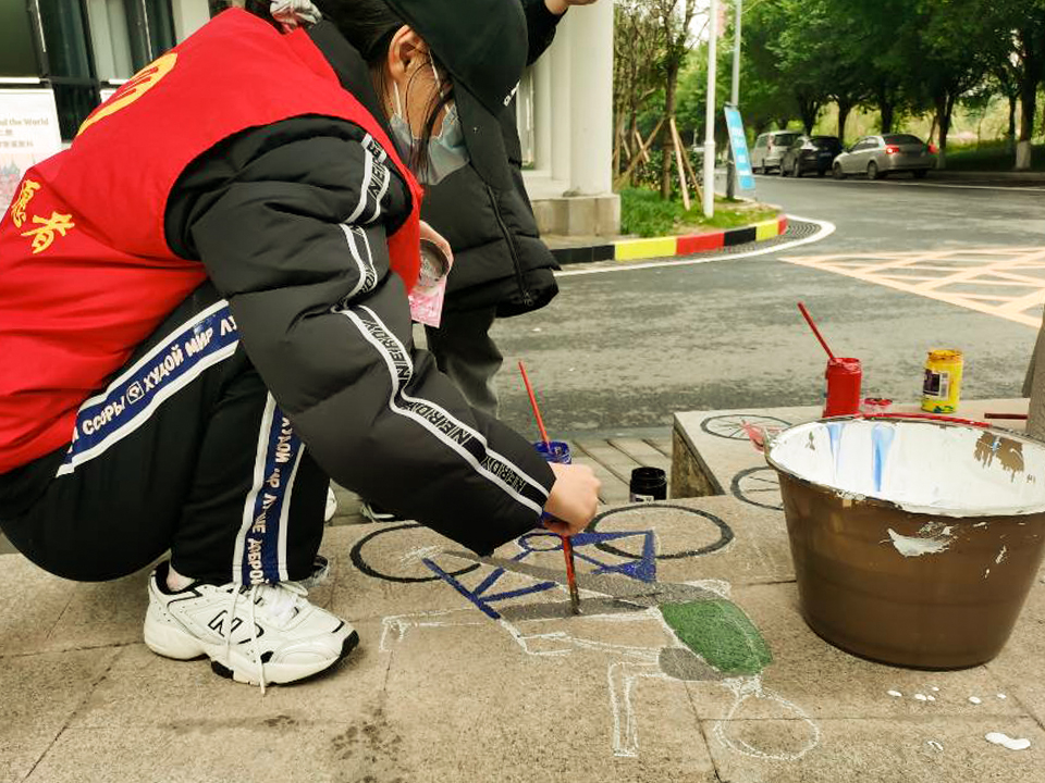 青协志愿者们协同南湖书院工作人员经过前期的充分准备,确定好了彩绘的主题和内容,以及颜料、画笔、水桶等一系列工具。活动正式开始时各人员直奔主题,现场各组分工明确、团结一致,将纸张上的一幅幅美丽的画稿彩绘到南湖书院之中,运用事先调制好的颜料将自行车标、鹿头以及各类标志具象化。其中鹿头十分引人注目,来往同学纷纷停下繁忙的脚步,进行拍照留念。醒目的自行车道标识,提醒同学们要时刻注意提高安全和规范意识。