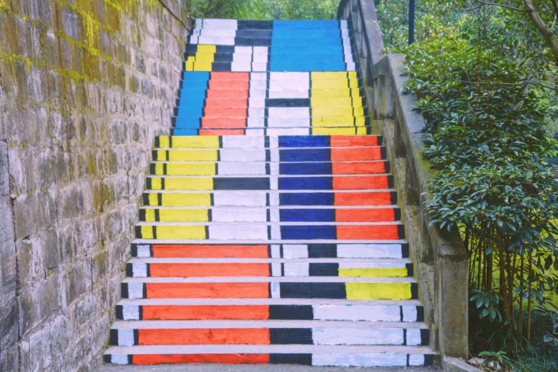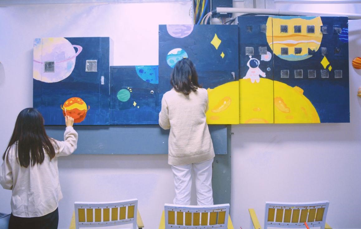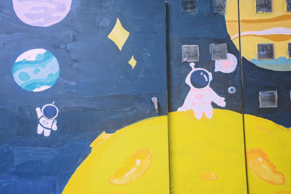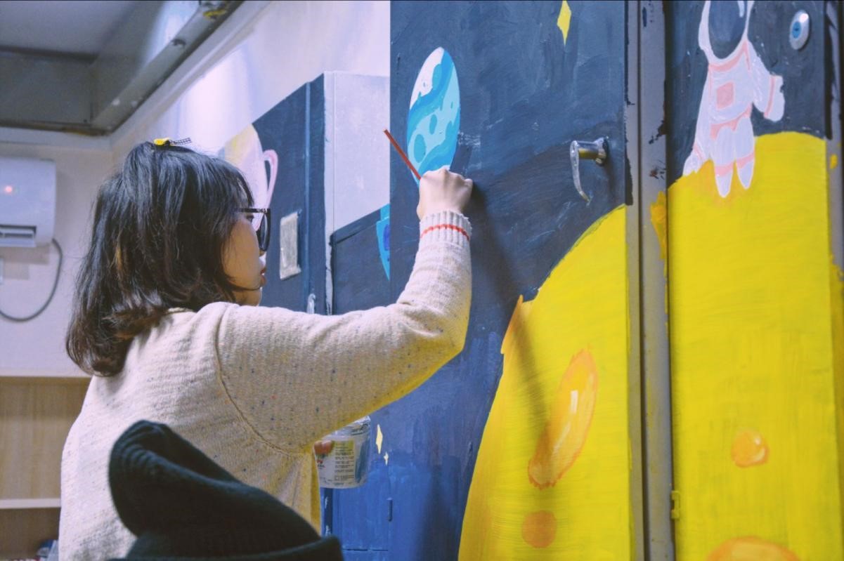 活动现场各组分工明确紧密配合,各组队员都将自己的绘画功底完全展现出来,先用粉笔绘制轮廓,再一步步描图、修整、上色。随着时间的推移,单调的墙面、楼梯、配电箱被队员们用五彩斑斓的颜料慢慢填满,负责墙面与楼梯的队伍还对排版和环境多变性的考虑,对方案进行了改进,力争实现彩绘图案后续的长久保存。在活动接近尾声,彩绘工作收工时,上下课路过的学子们都不禁驻足欣赏,拿出手机拍照打卡。
