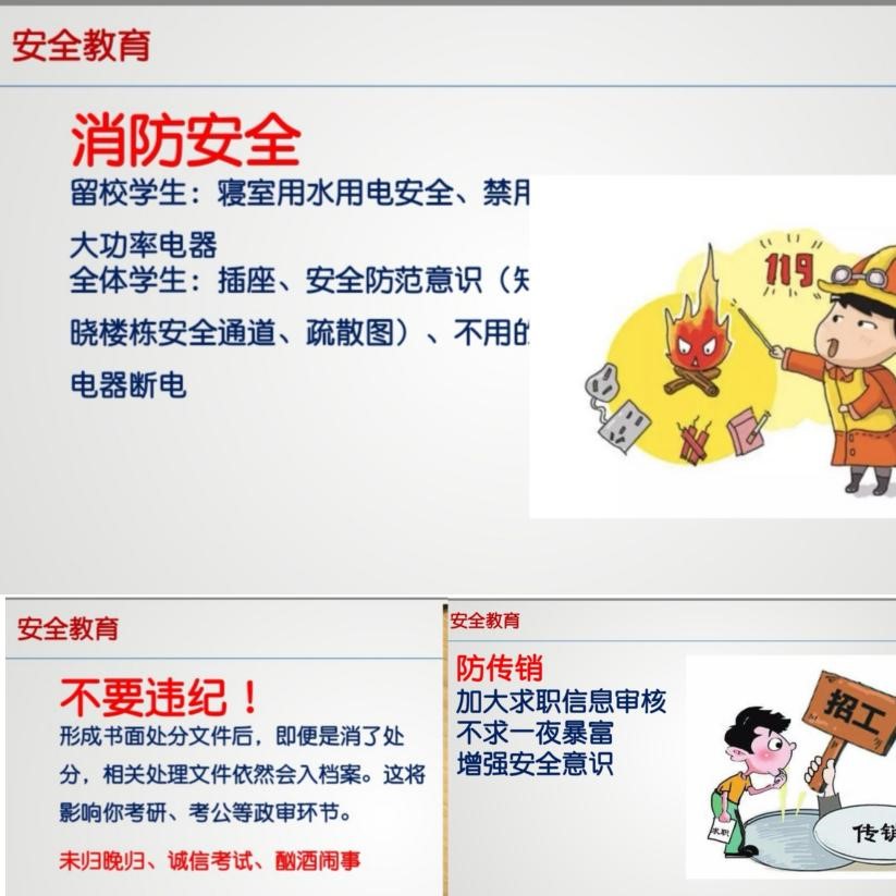 安全教育是维护大学生安全的一项基础教育,尤其大四学生大部分都离校,在外租房,安全教育显得更为重要。此次年级会谈及了消防安全、求职安全、防盗防欺诈、人生安全等。会议目的是通过安全教育的学习,提高学生的安全防范意识,提醒同学要始终保持警惕和清醒的头脑,增强自我保护能力,教育和引导学生树立正确的价值观和择业观,在求职过程中提高警惕,安全入职。