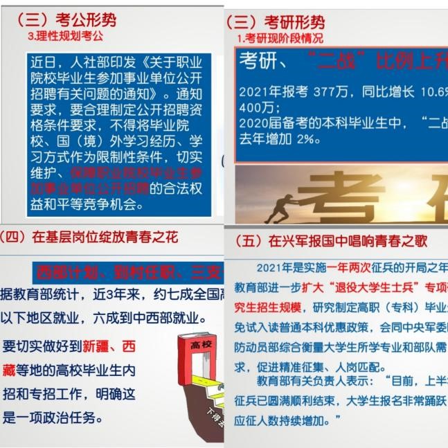 对正在准备考公、考研的同学,传达并解读最新的政策文件,让同学们做好理性规划。并对基层工作、征兵入伍做了宣传。增强学生的国防意识,服务基层扎根边疆的意识,这也是就业的不错选择。