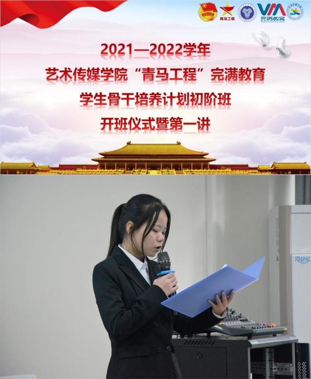 “我们是五月的花海,用青春拥抱时代......”随着洪亮的团歌奏唱中,艺术传媒学院2021-2022学年“青马工程”完骨初阶班开班仪式正式开始。主持人为大家简单的介绍了这一学年的课程培养计划,让学生骨干们对于课程有了一定的了解。
