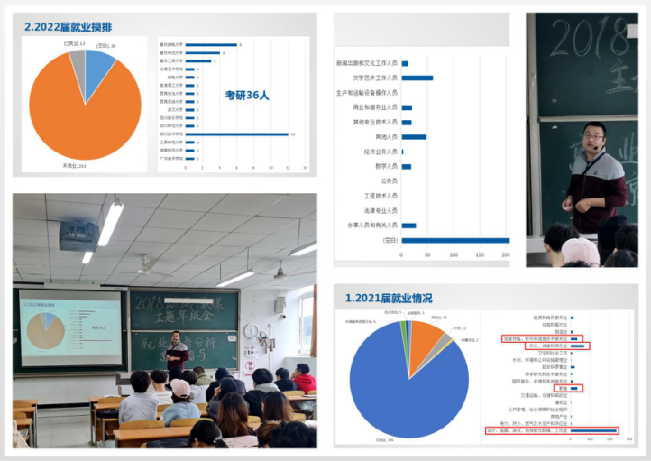 会议的第一项是关于就业分析。数据不会说谎,对于上一年的就业情况、就业的种类和职业人数等进行了归类,运用饼状、柱状、条形统计图等一系列直观的方式,让学生充分了解就业形式。就业中既要讲究专业性,但也不要对自己有死板的限定。从上一届学生的就业情况可以看出,动画和数字媒体艺术也有一定数量的同学选择了跨专业就业;从生源地信息及最终就业地域情况分析看出,绝大多数同学,依然选择了在家所在的城市就业;对于学生热衷的考研考公,数据显示仅有3.5%成功上岸,从而让同学们更加理性的去对待考研考公。面对目前各行各业各地区的用工需求,这份数据报告无疑给了学生最好的参考案例。