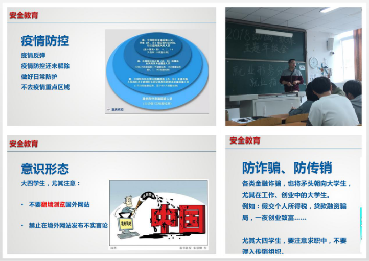 大会的第三项,为大四安全注意事项。实习的日子越来越近,有些同学即将离校,而有些同学则会继续留校复习考试,那么对于大四学生的实习管理、在校管理以及对于职场中出现的新型诈骗、传销,通过年级会也进行了纪律意识强化以及警示教育。特别强调了对于离校之后的安全注意事项。面对现在的疫情形式依旧严峻复杂,还是要继续做好疫情防控措施。