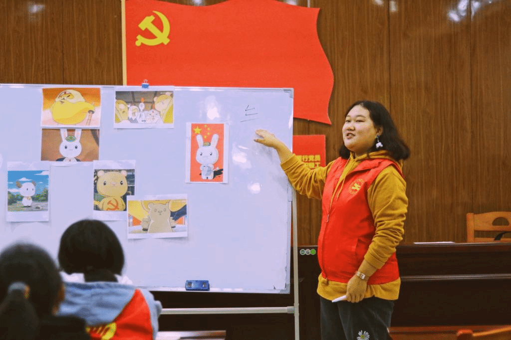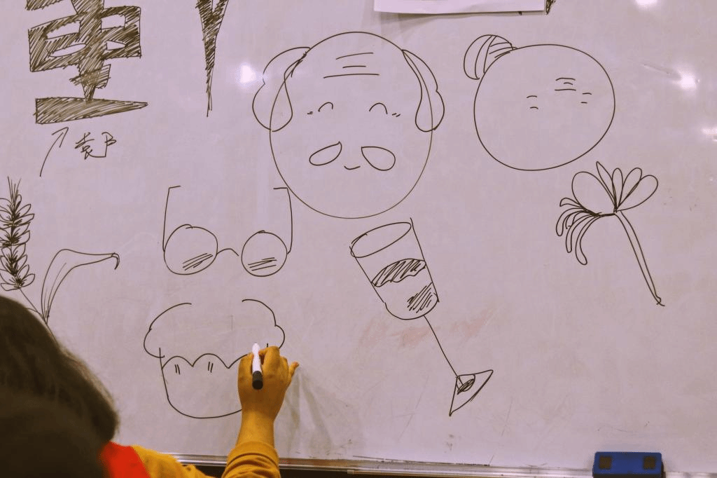 在志愿者们的指引下,小朋友们有秩序来到社区功能室并端正的坐着,等待着上课。对于这次活动的主题,志愿者小老师并没有提前告知,而是在白板上面绘制与重阳节相关的图案,通过“你画我猜”的形式来调动大家的积极性。果不其然,小朋友们纷纷举手参与,就连“茱萸”这种复杂的图案,都被小朋友们猜了出来,课前的“预热”不仅打开了氛围,也让小朋友们知道了这次课堂主题“敬老节”。
