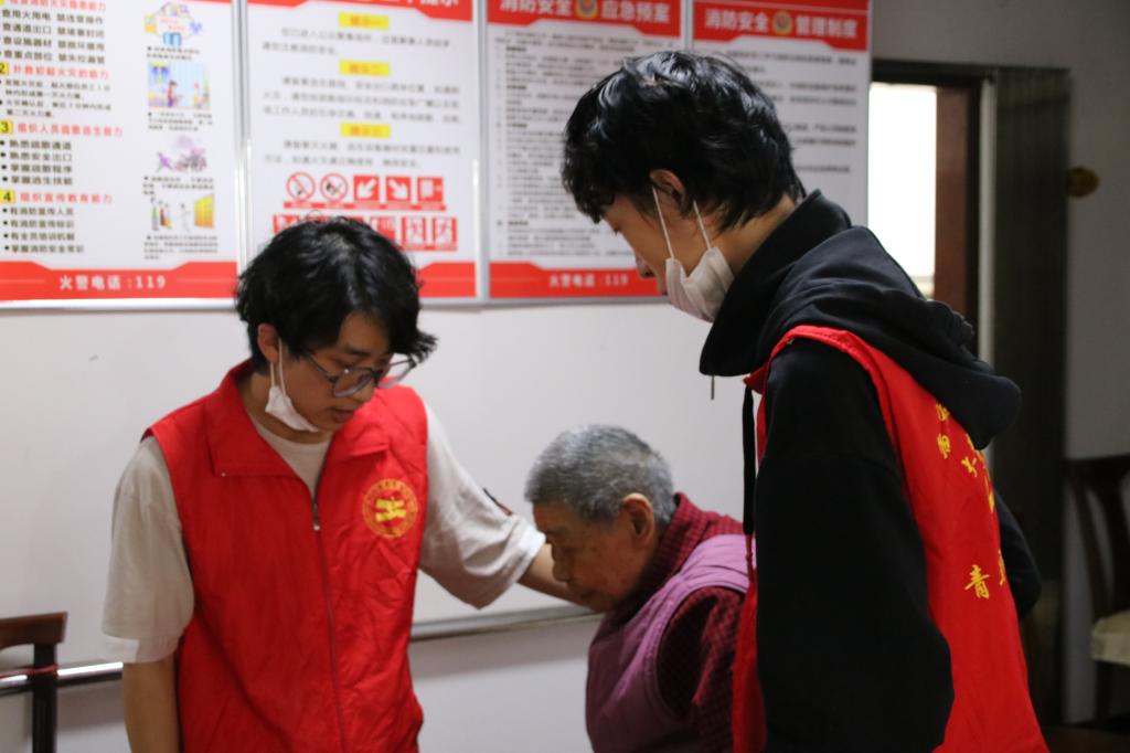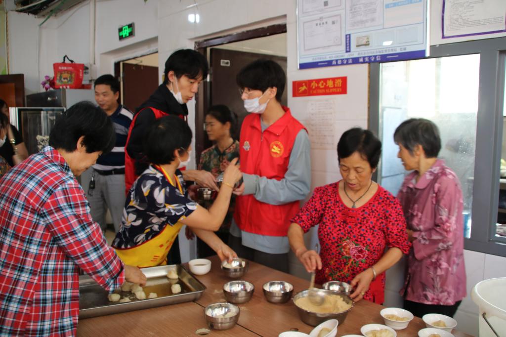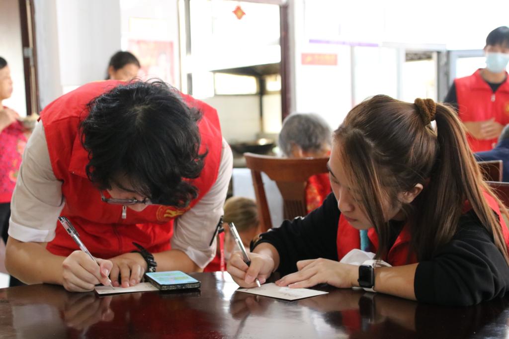 表演结束后,桌上早已备好糯米,志愿者们撸起袖子,一齐捯饬,一晃眼的功夫糯米就变成了糍粑,志愿者们将一碗碗撒上红糖粉的糍粑送到爷爷奶奶们面前,老人们坐着,少年们站着,大家一起吃着红糖糍粑有说有笑,这一其乐融融的画面被相机永远“定格”下来。温馨的时光一晃而过,临走前,志愿者们在空白的贺卡上写满了对老人们的祝福,其一笔一划都透露出深切的情感,这一张张贺卡,描绘出了人间爱的模样。