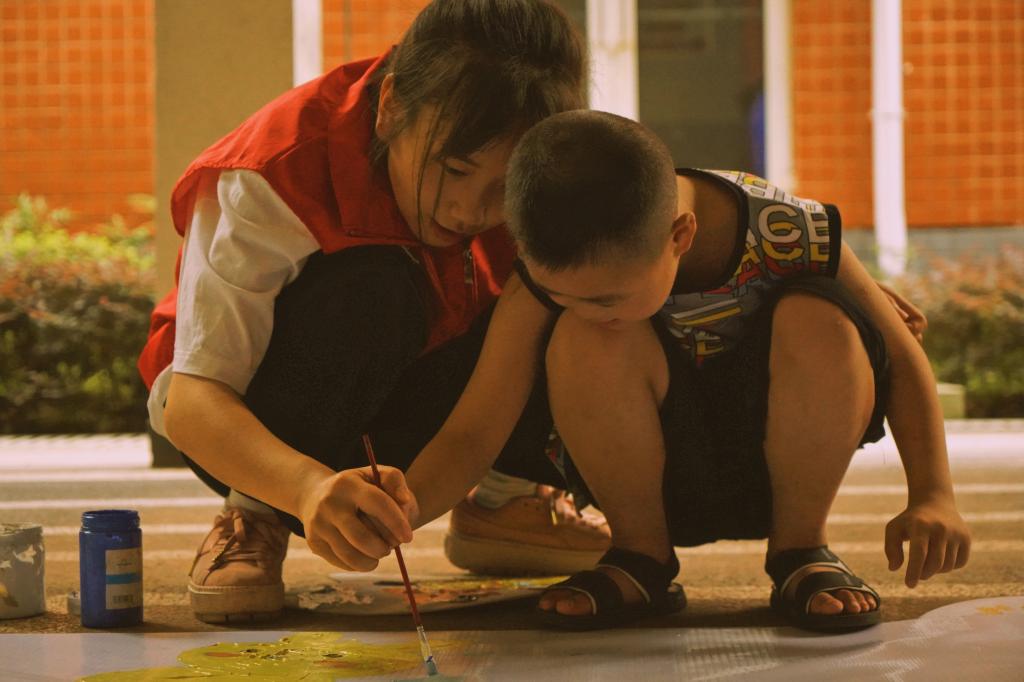 夏日的雨后气温有些闷热,但丝毫不能阻挡“星星的孩子”欢洽的脚步。在“卫星”志愿者的带领下,家长和小孩来到重庆移通学院别读书院四维空间楼下,志愿者们大手握小手,细心引导小朋友进行十米画卷的颜色填充,他们挥舞着笔尖留下一幅幅奇幻的图案,这或许就是来自自闭症儿童内心深处的畅想,即使他们封闭自己的双唇不与外界交流,可思维却格外活跃,每一个孩子都是“奇思妙想”的小能手。