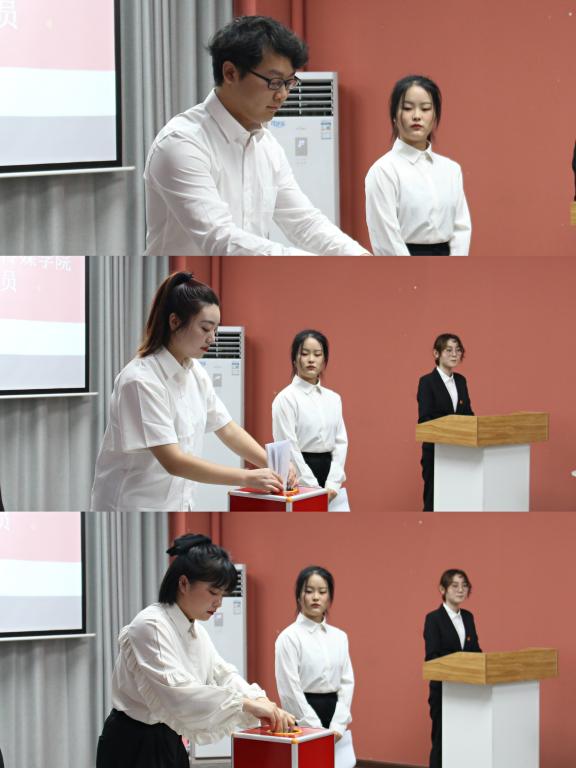 大会伊始,由重庆移通学院艺术传媒学院陈婷婷老师宣读学代会批复。随后,进入大会第二项议程,选举产生重庆移通学院艺术传媒学院第一届学生委员会委员。在确定参会人数符合规定后,选举正式拉开帷幕,计票人黎灵盈分发选票、在监票人韦兵熠的监督下完成各位正式代表人物的投票,并在计票人的引导下按照指定路线到指定的票箱依次投票。
