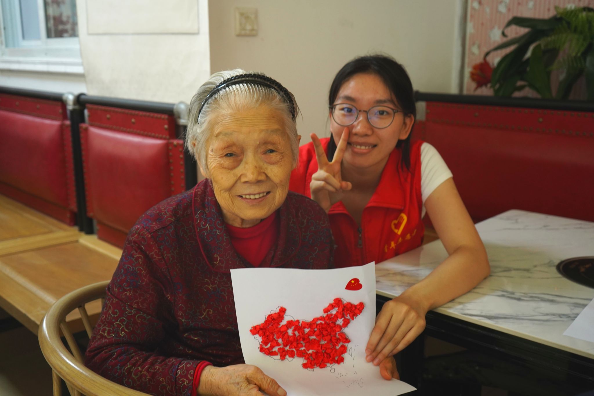 紧随其后的“制作卡纸国旗”环节同样精彩。志愿者围绕国旗设计规范展开细致讲解,讲解结束后,在志愿者的一对一协助下,老人们手持剪刀,仔细裁剪红色卡纸作为国旗底色,又精准剪出五颗明亮的黄色五角星,而后小心翼翼地将五角星粘贴到旗面指定位置。当一面面色彩鲜亮、象征国家尊严与荣耀的小国旗完整呈现时,老人们脸上绽放出自豪又幸福的笑容,眼神中满是对祖国的深厚情感与无限祝福。