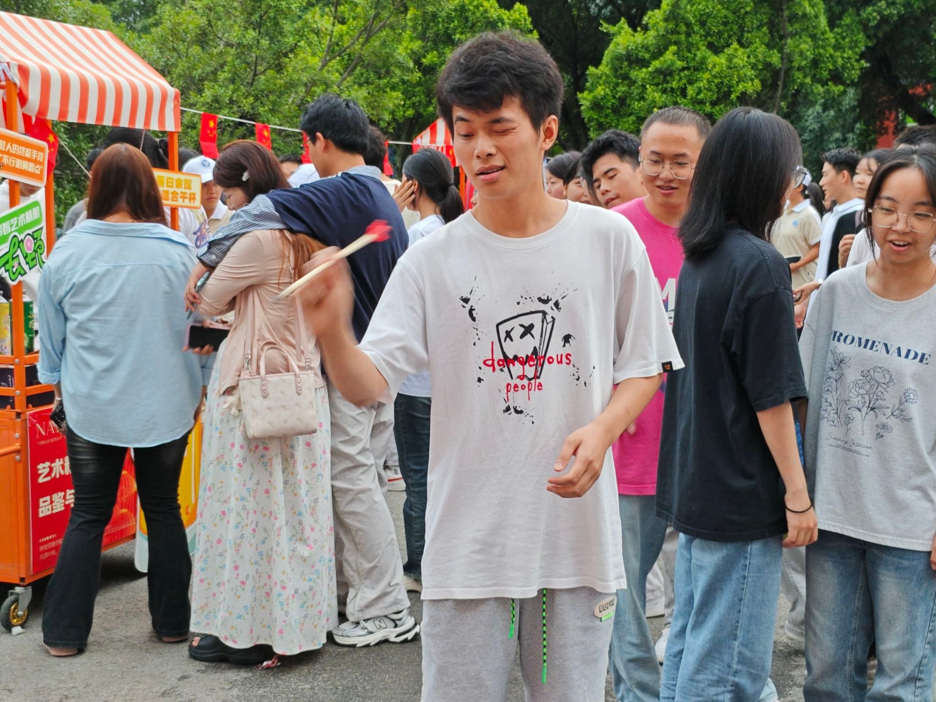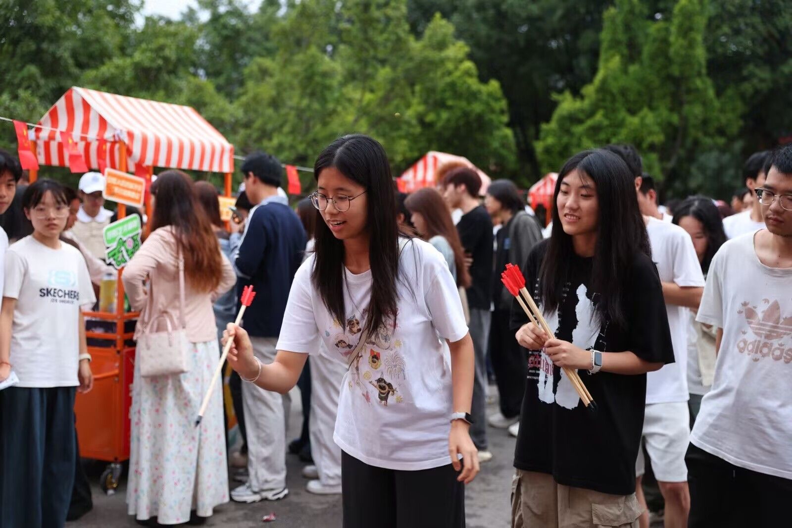 活动现场,3个刻有云纹的古朴木质投壶前格外热闹。同学们依次上前各显身手:有人身体微倾,目光紧盯壶口,手腕轻扬间箭矢入壶,引周围一阵欢呼;有人稍显紧张,深呼吸后才缓缓投出,即便箭矢擦壶而过,也笑着和同伴调侃“下次一定中”。“投中5支箭就能兑换大奖品咯!”工作人员,一边递箭矢,一边介绍规则。不少同学兑换到奖品后,立刻和同伴分享喜悦,现场氛围更显热闹。