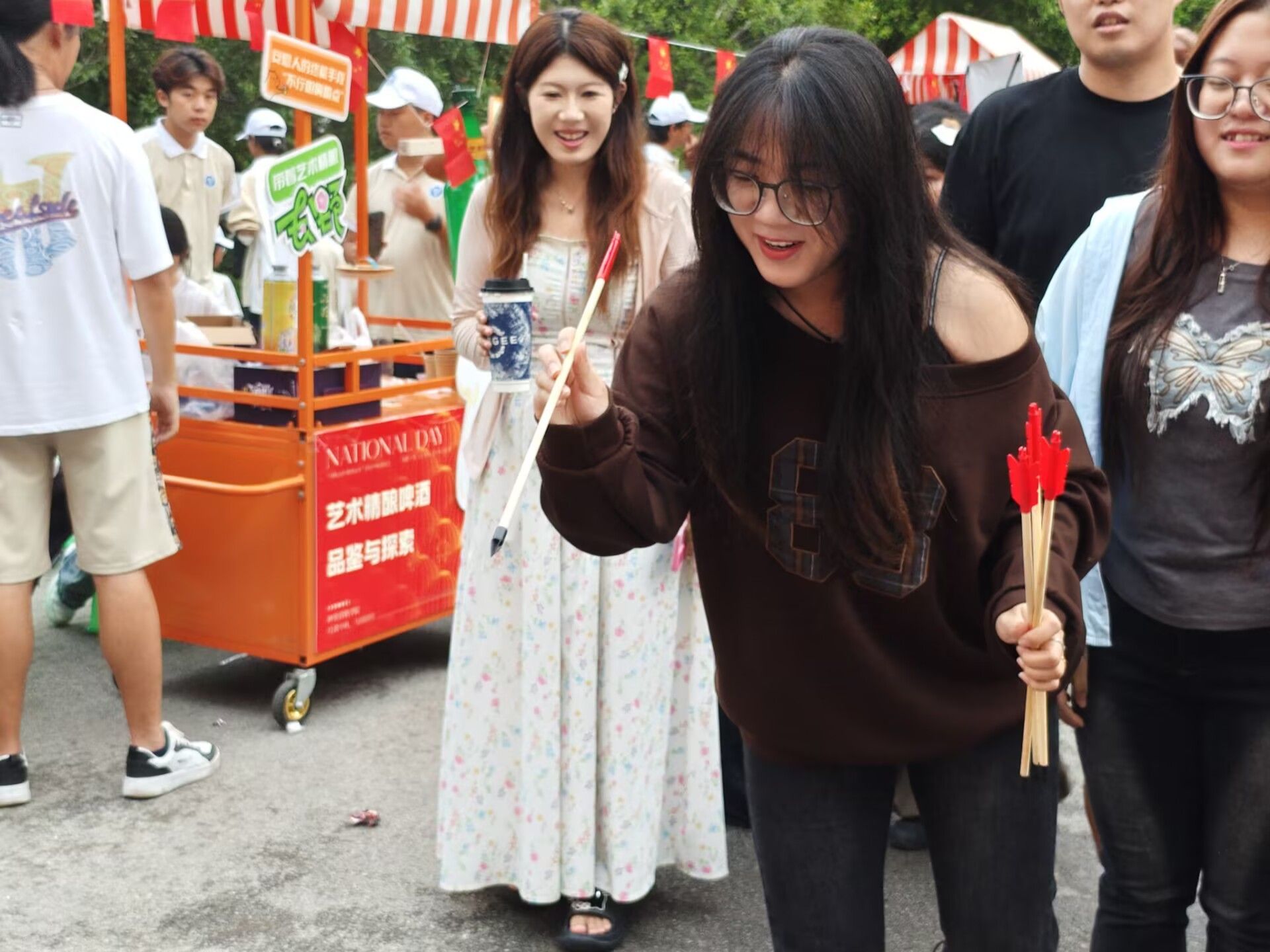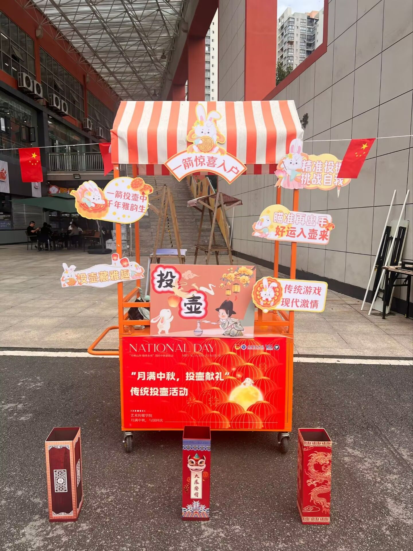 金秋送爽,双节同庆,国庆的红韵遇上了中秋的皎洁。9月26日晚18:00“月映山河,锦绣未央”国庆中秋游园会正如火如荼开展。在这片热闹景象中,由艺术传媒学院学生会社团活动部精心筹备的“月满中秋,投壶献礼”传统投壶活动,于三江食堂小广场悄然拉开帷幕。古色古香的游戏形式搭配充满心意的特色奖品,让这场传统互动一亮相,便迅速展现超高人气,成为双节游园会上最引人瞩目的“亮点环节”。