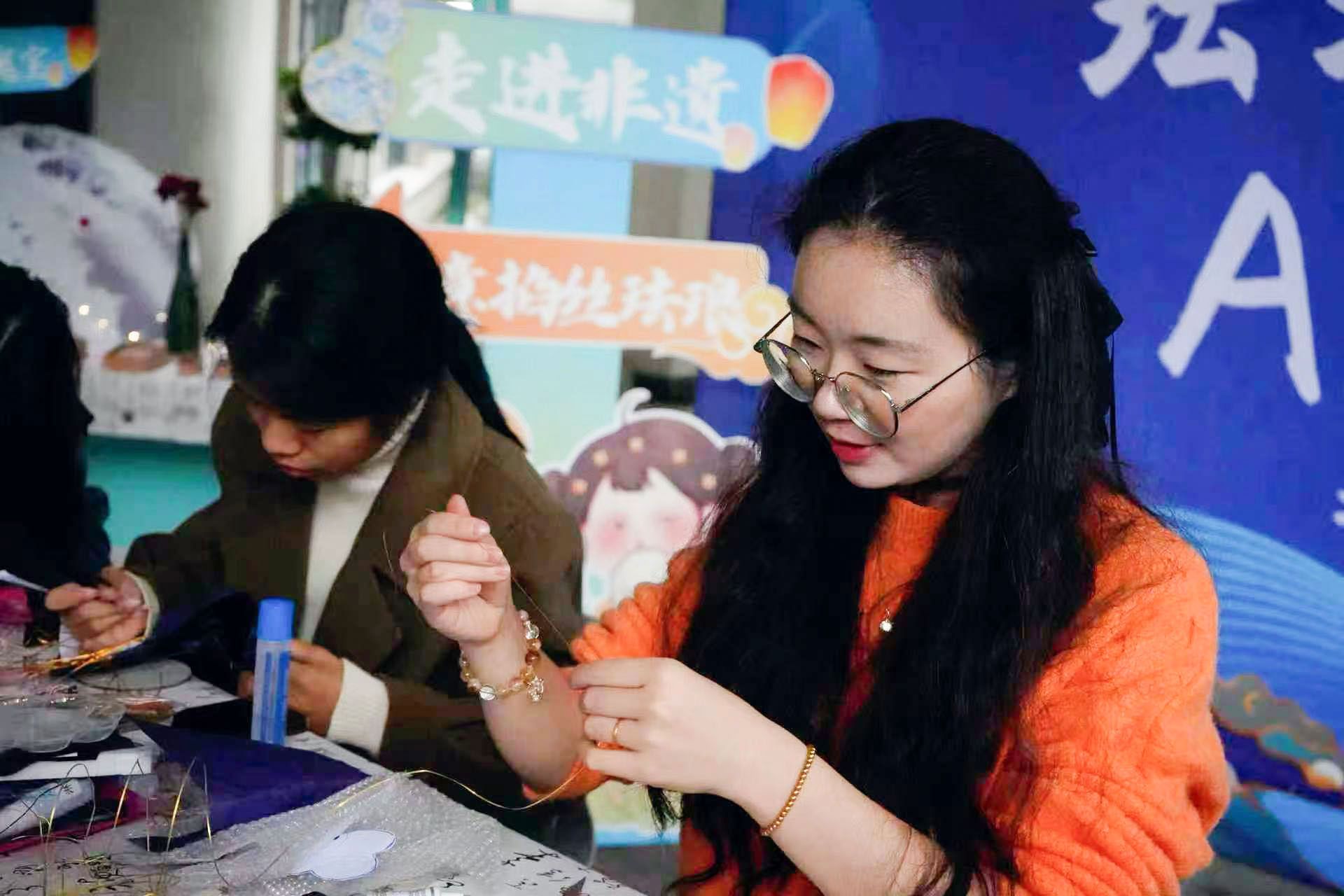 本次第九届创意·科技文化节暨首届“AI+”生活科技节子活动——珐琅掐丝品创意,AI携手筑非遗,由重庆移通学院校团委主办,艺术传媒学院承办,并于2025年10月29日在天空书院底楼小广场特别开设活动体验专场。百余名师生走出课堂、动手实践,在金属丝的弯折与彩砂的铺陈中,解锁传统与科技碰撞的独特魅力,为科技节增添了一抹厚重而鲜活的文化亮色。